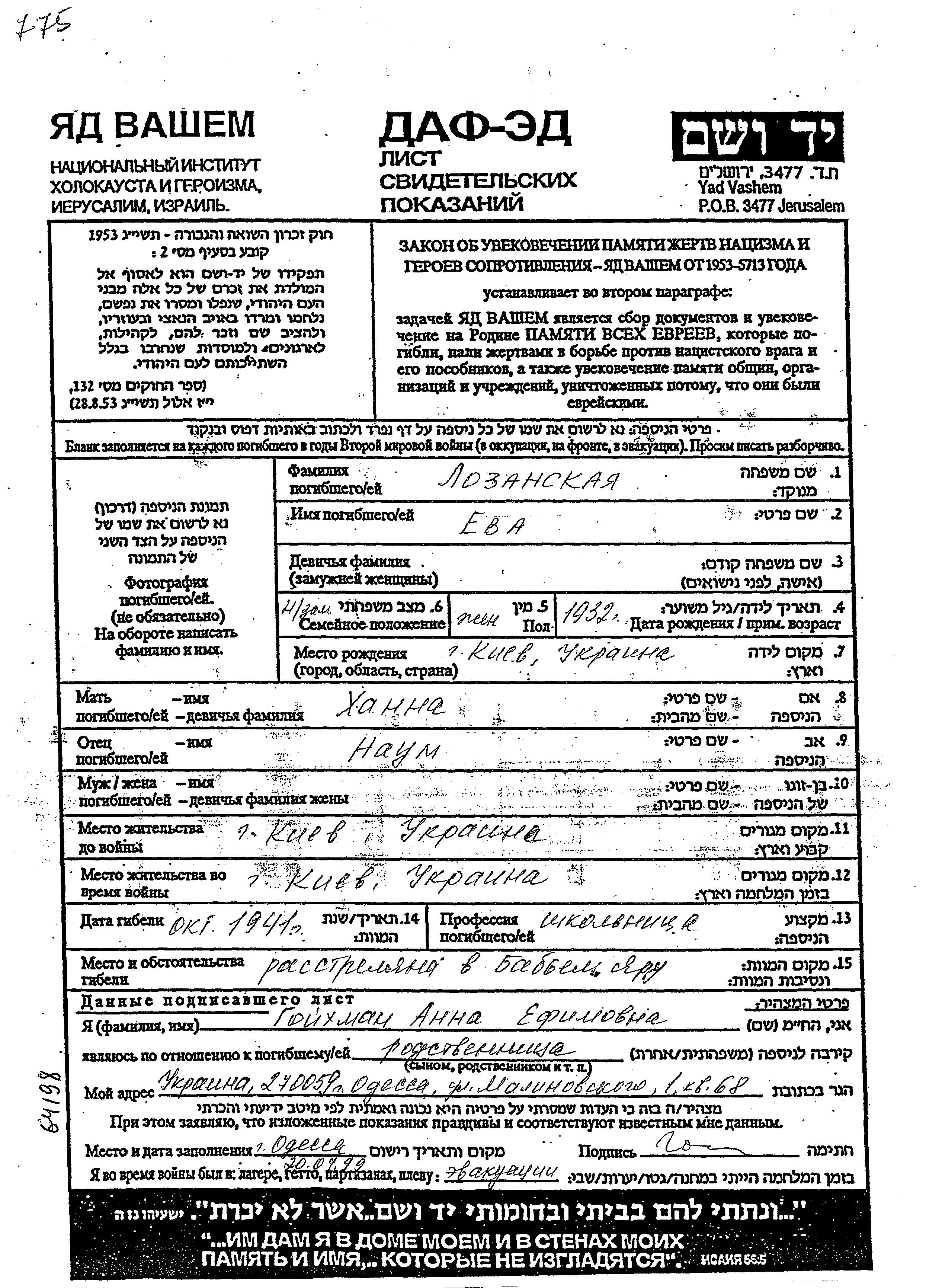 Lozanski Yeva 1932 Kiyev, Ukraine (URSS) Feuille de témoignage