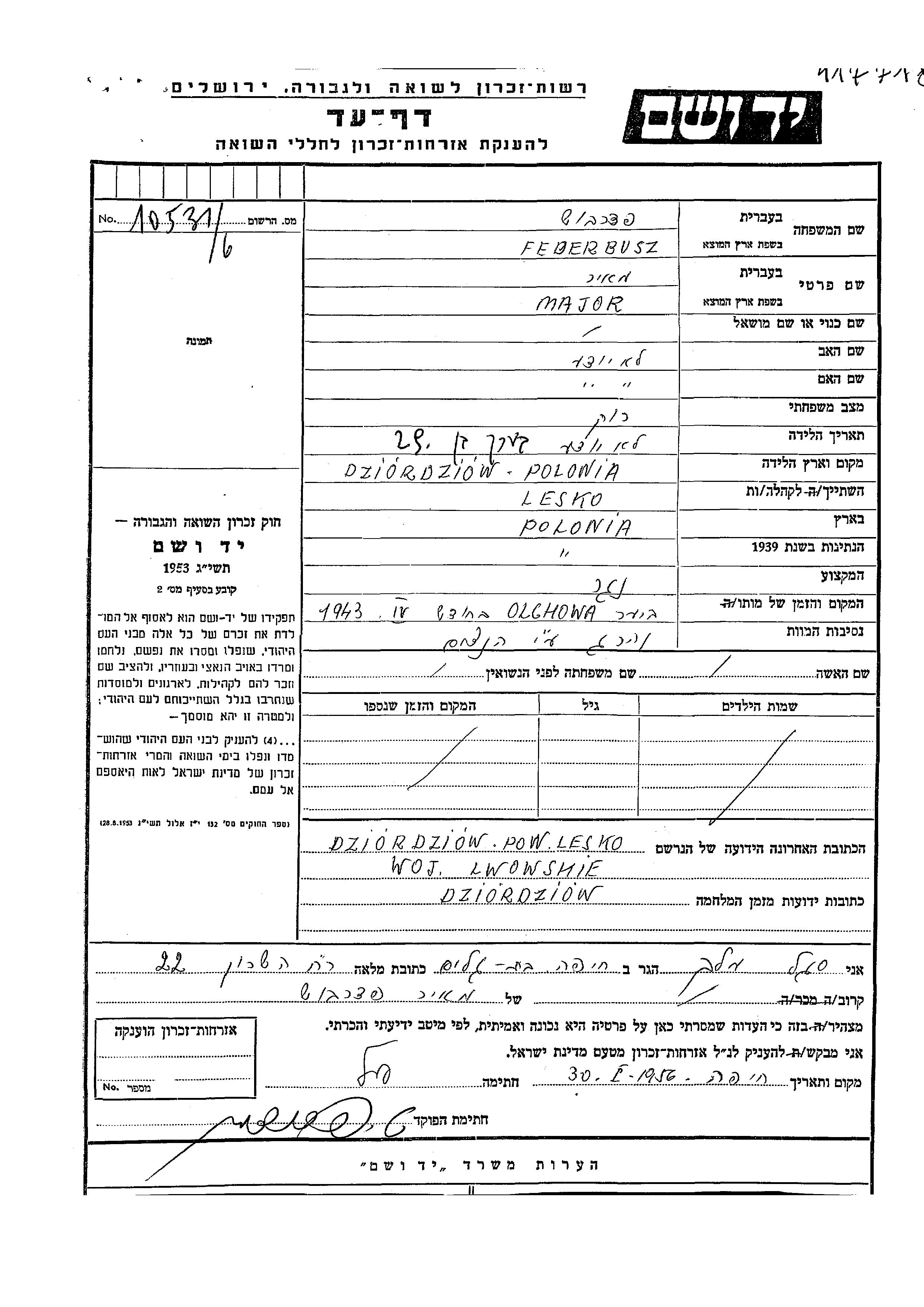 Federbusz Meir Lesko, Pologne Feuille de témoignage