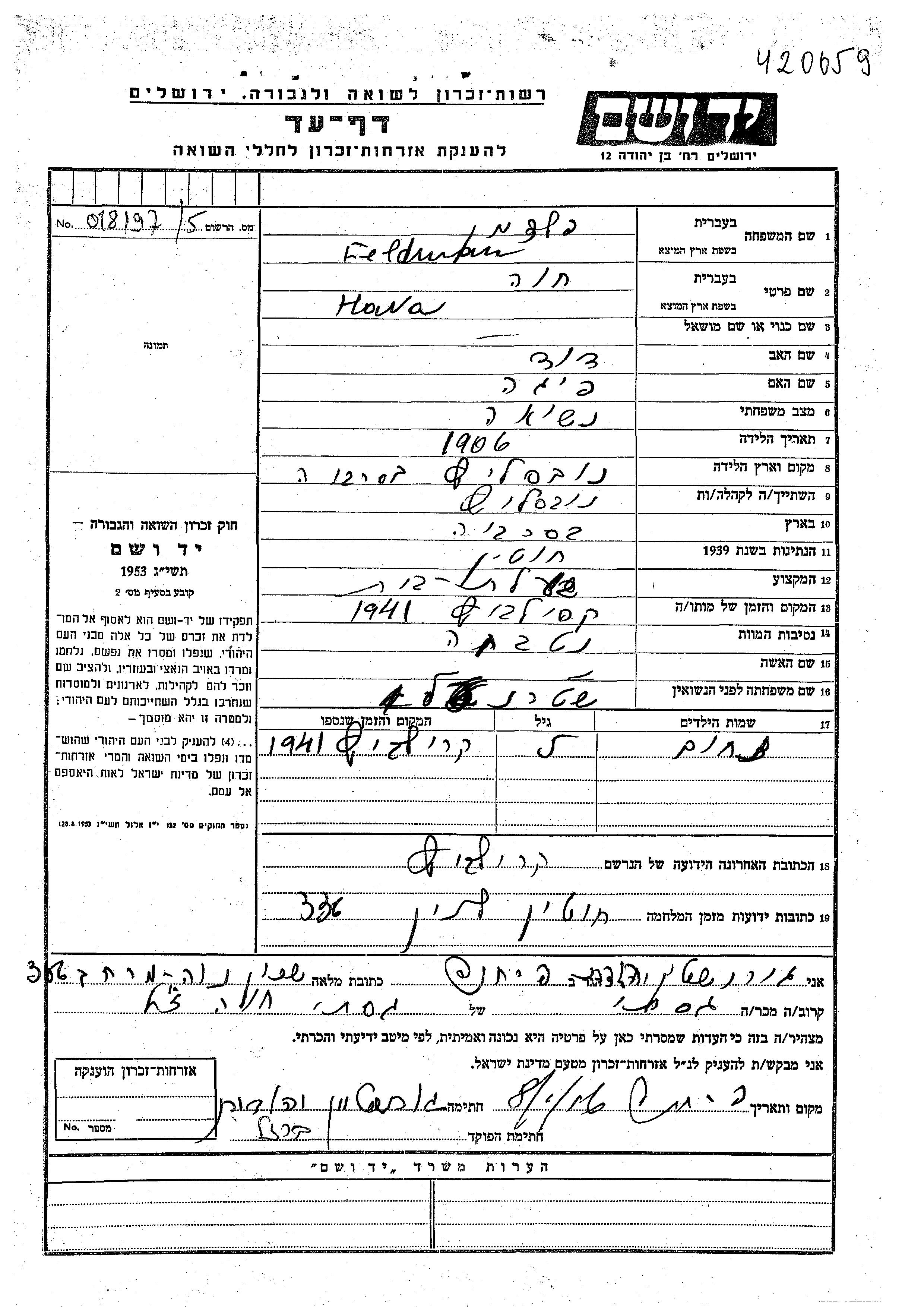 | Feldman | Hawa | 1906 | Sulita Noua, Roumanie | Feuille de témoignage |