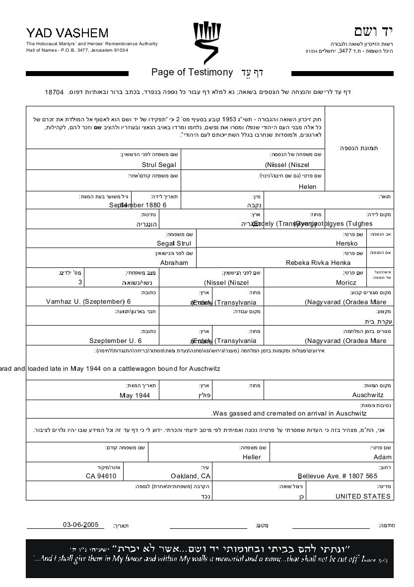 Helen Niszel née Strul Segal est née en 1880. Elle était Femme au foyer. Avant la seconde guerre mondiale elle vivait à Nagyvarad, Roumanie.