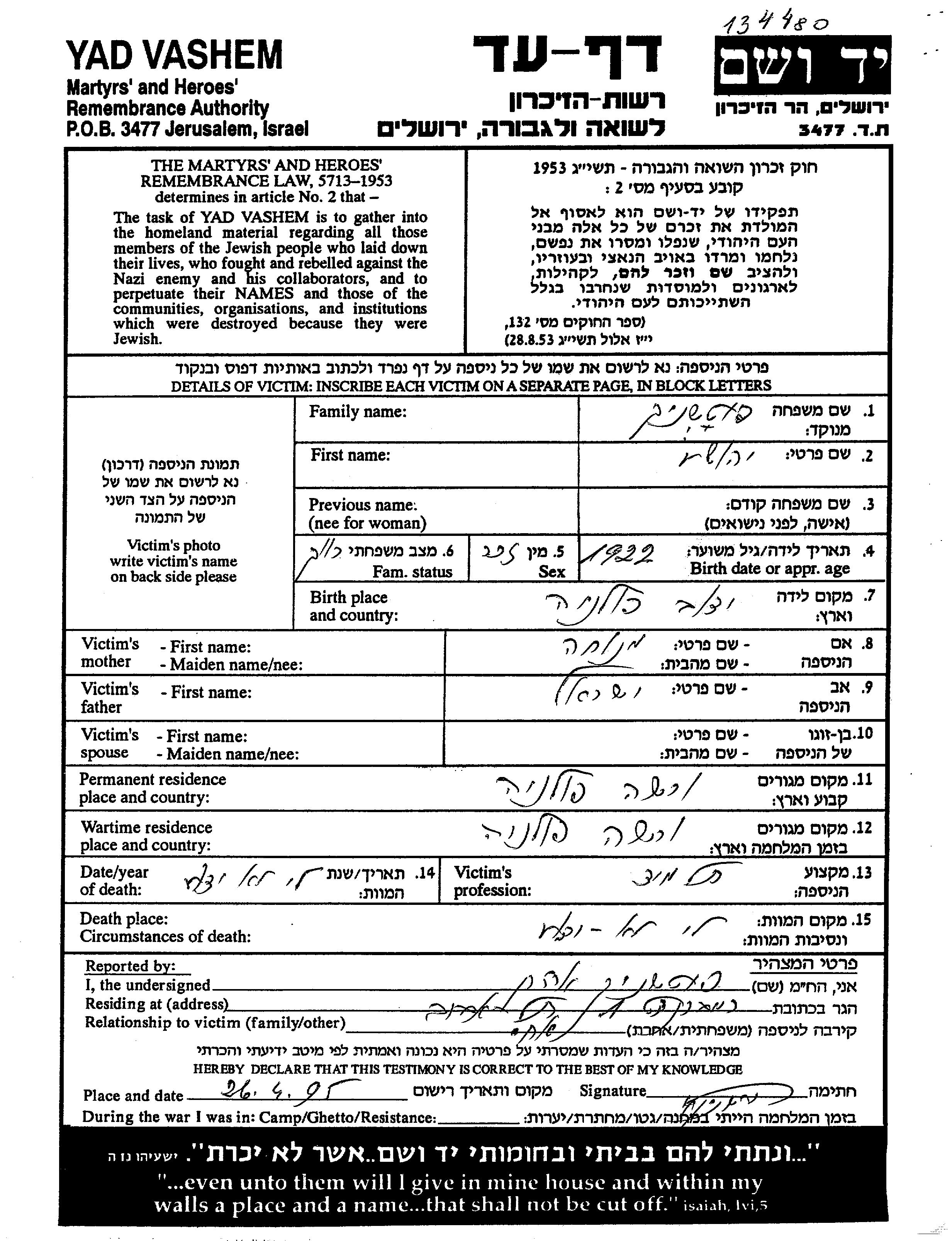 | Potashnik | Yehoshua | 1922 | Warszawa, Pologne | Feuille de témoignage |