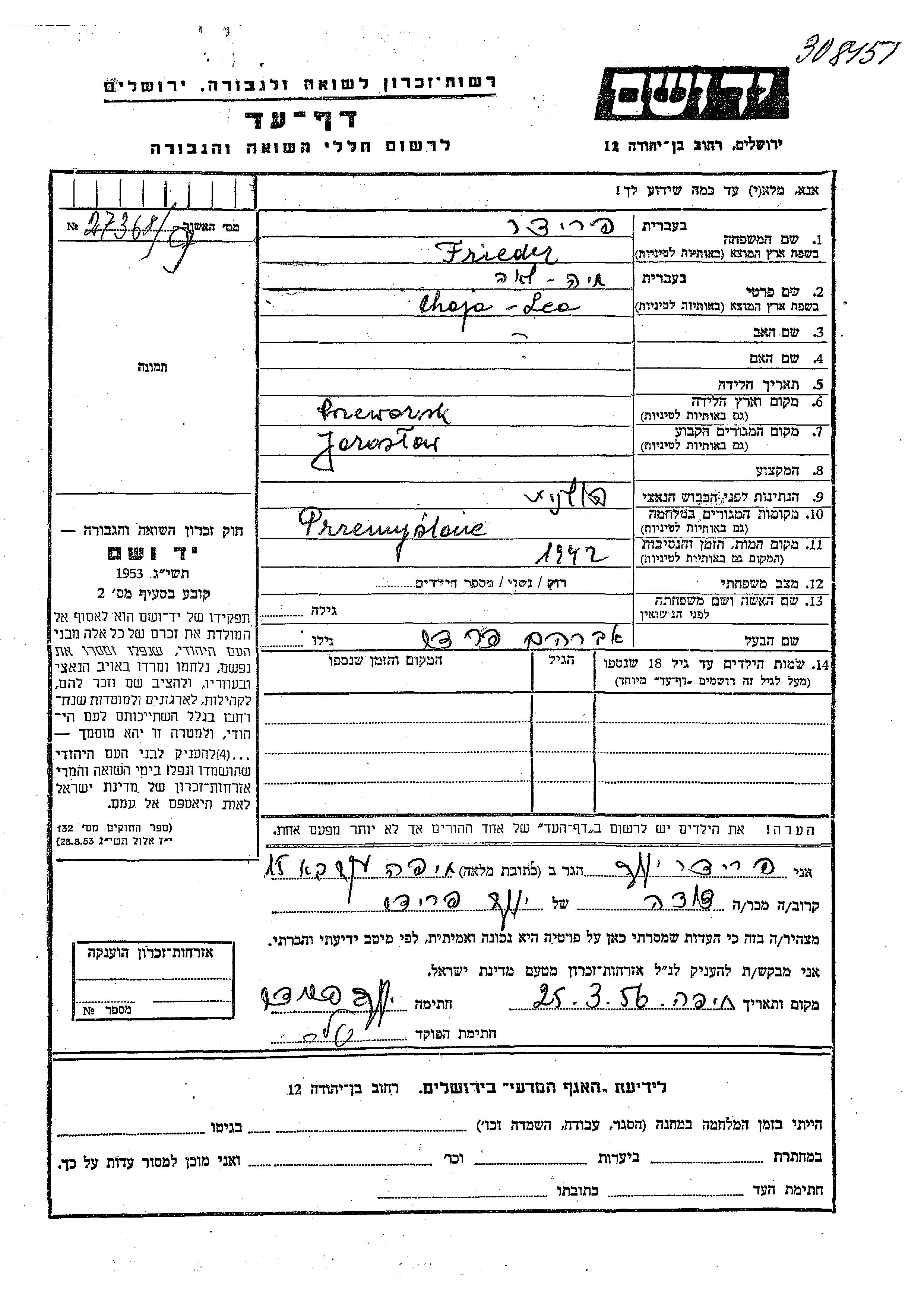 Frieder Chaja Lea Jaroslaw, Pologne Feuille de témoignage