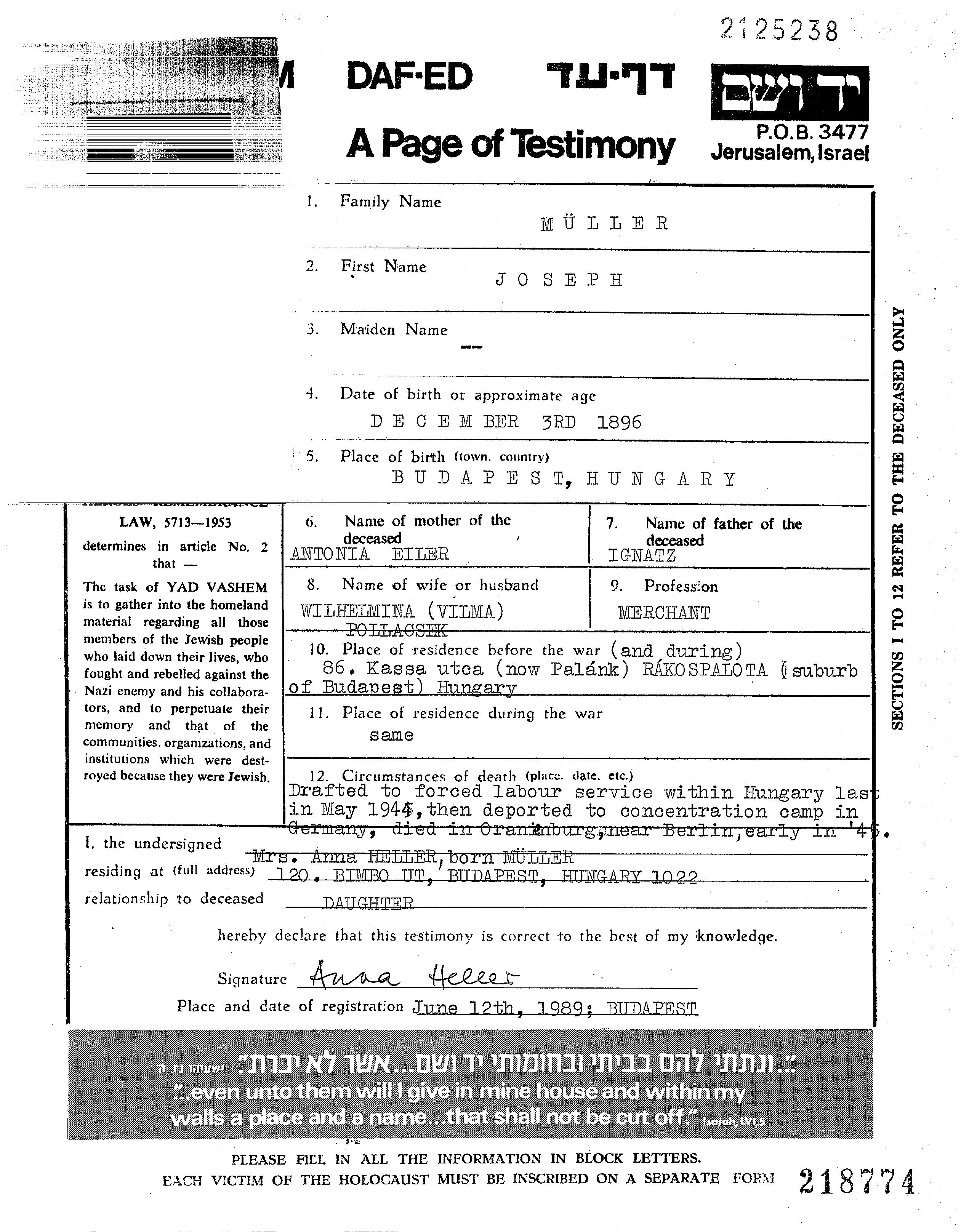 Yosef Mueller est né à Budapest, Hongrie en 1896. Il était Commerçant/e. Avant la seconde guerre mondiale il vivait à Rakospalota, Hongrie.