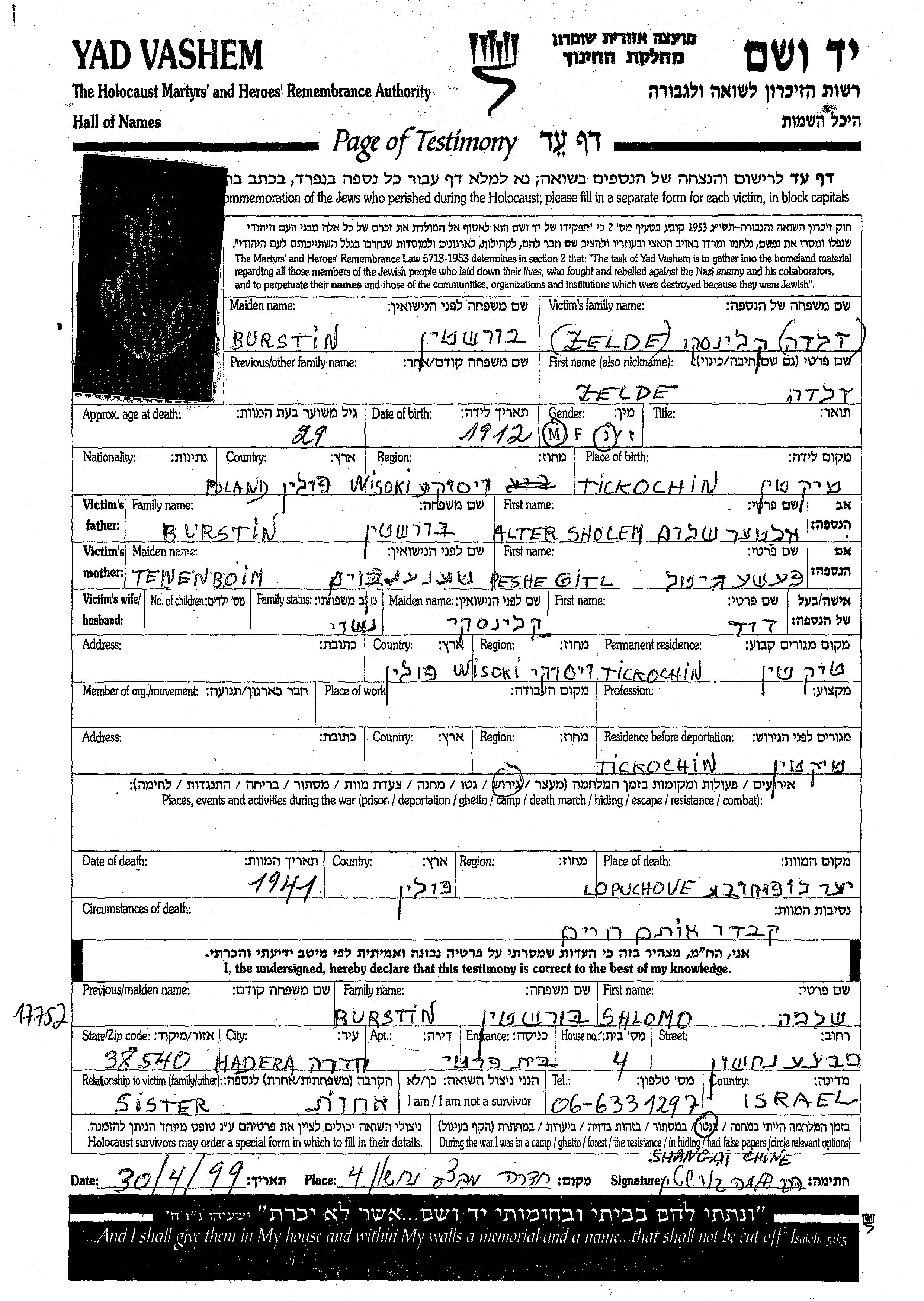 Kalinski Zelda Miriam 1912 Tykocin, Pologne Feuille de témoignage