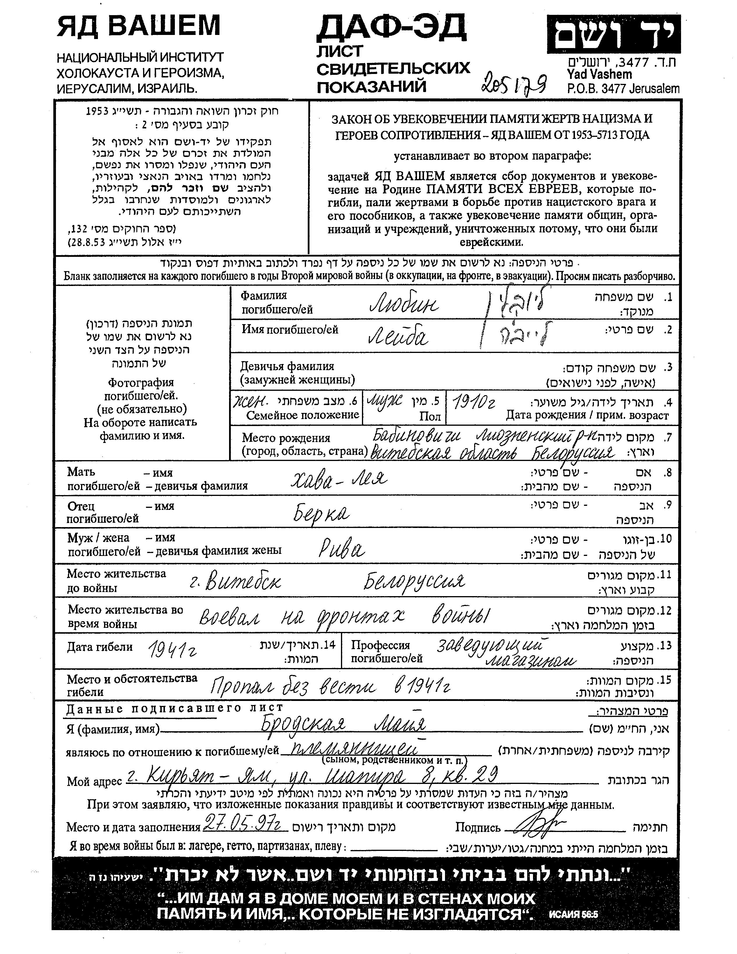 Lyubin Leiba 1910 Vitebsk, Bélorussie (URSS) Feuille de témoignage
