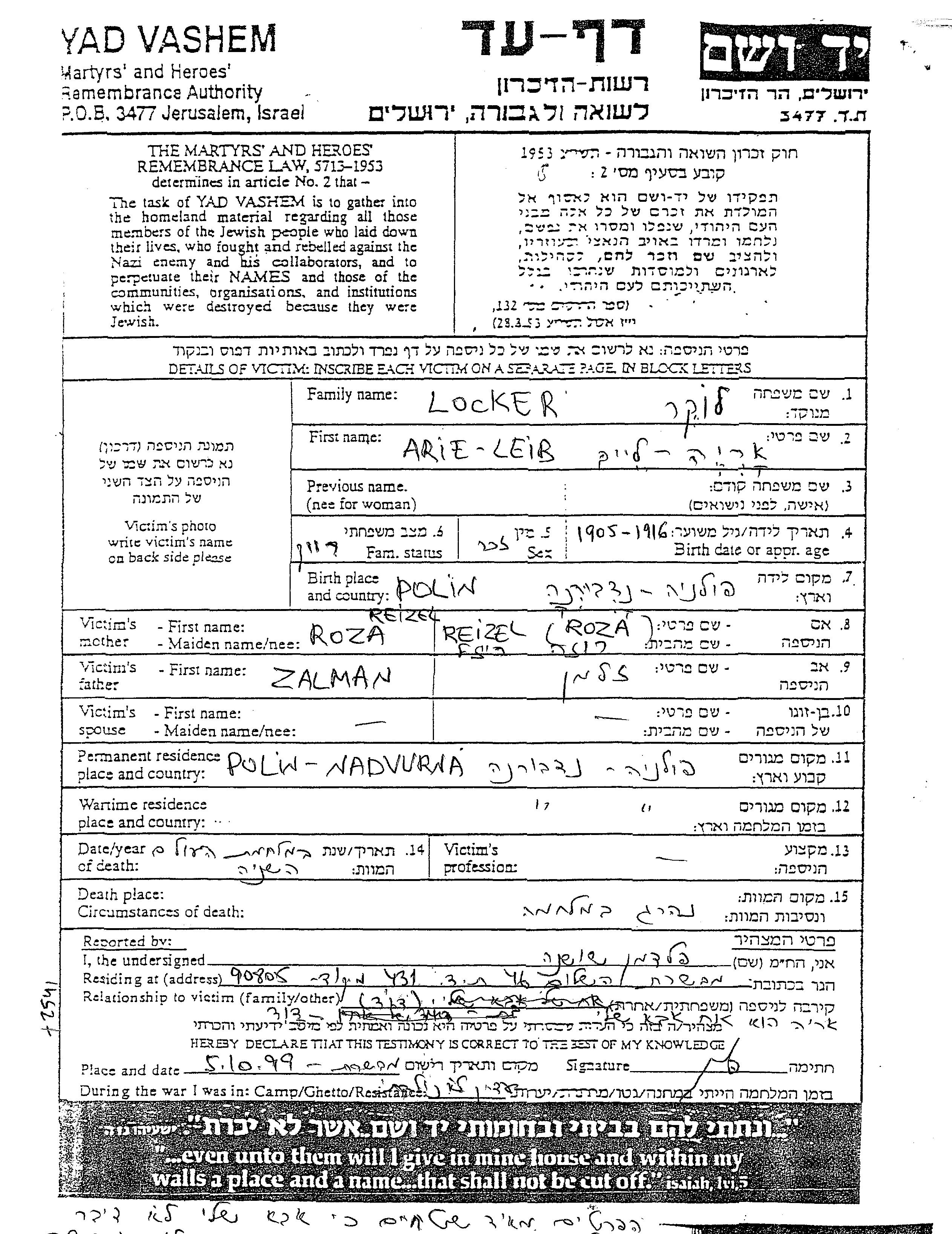 Locker Arie Leib 1905 Nadworna, Pologne Feuille de témoignage