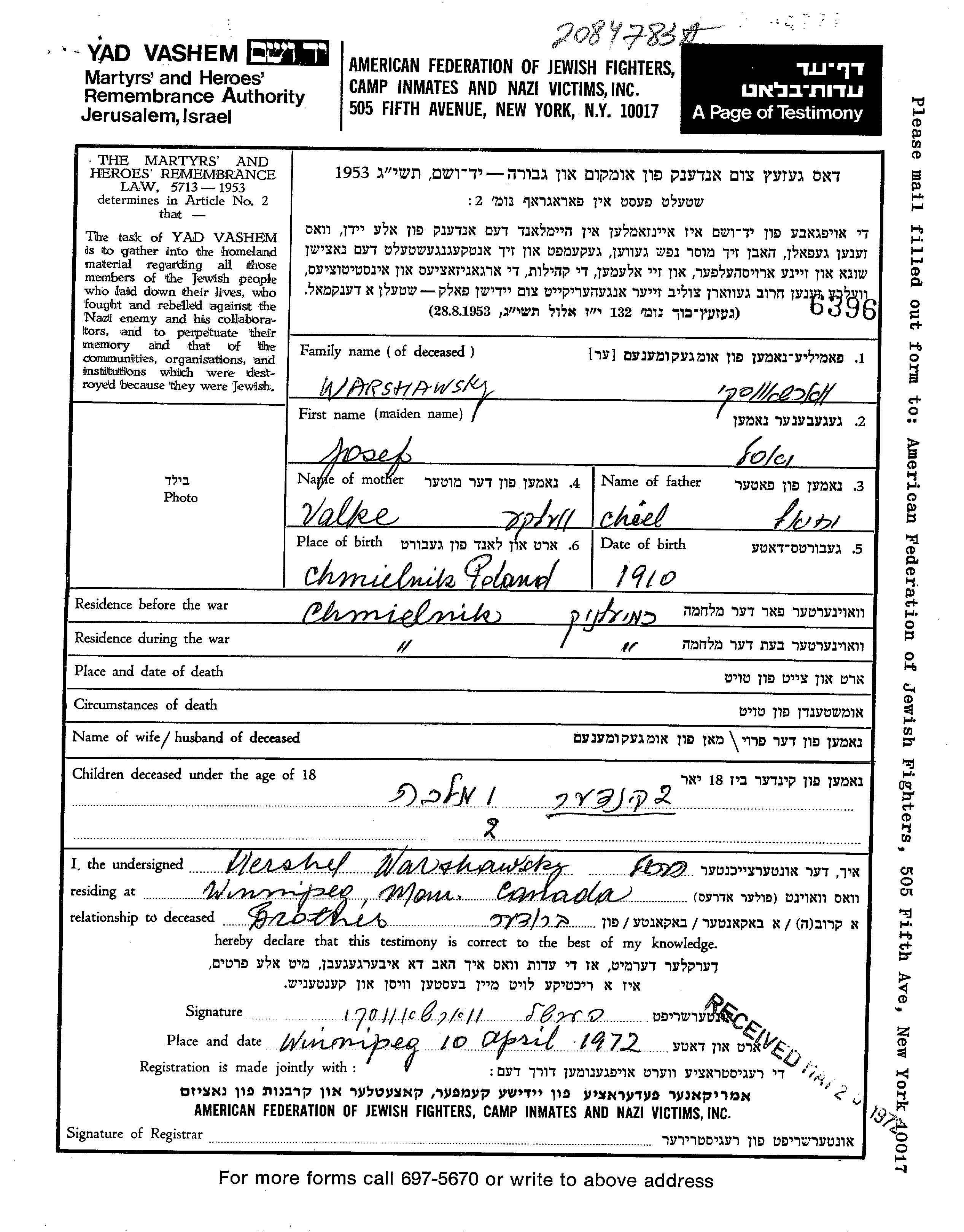 Warshawsky Josel 1910 Chmielni, Pologne Feuille de témoignage