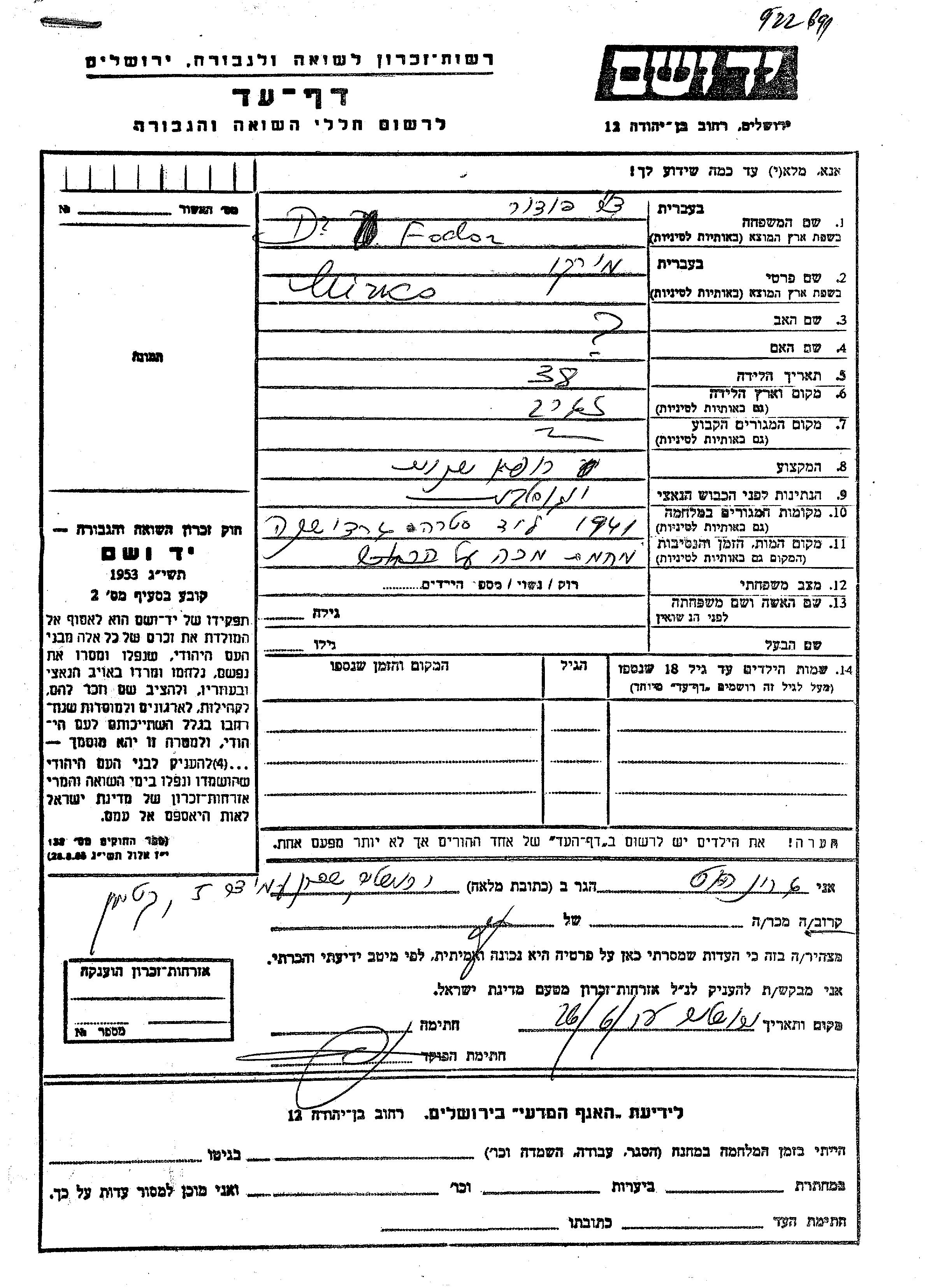 Fodor | Mirko | Zagreb, Yugoslavie | Feuille de témoignage | |