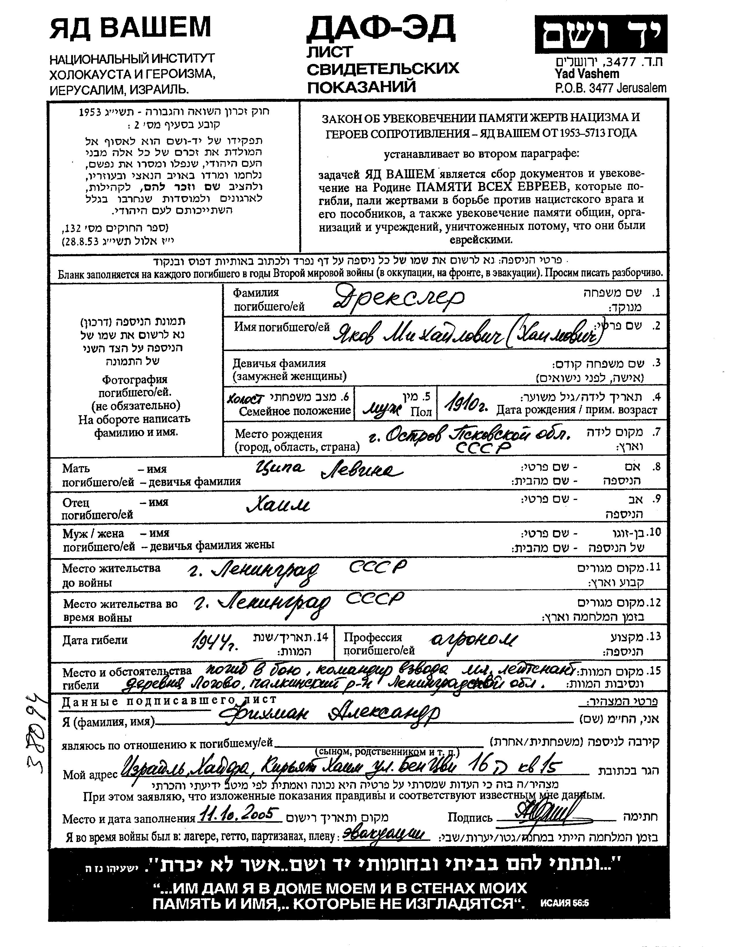 | Dreksler | Yakov | 1910 | Leningrad, Russie (URSS) | Feuille de témoignage |