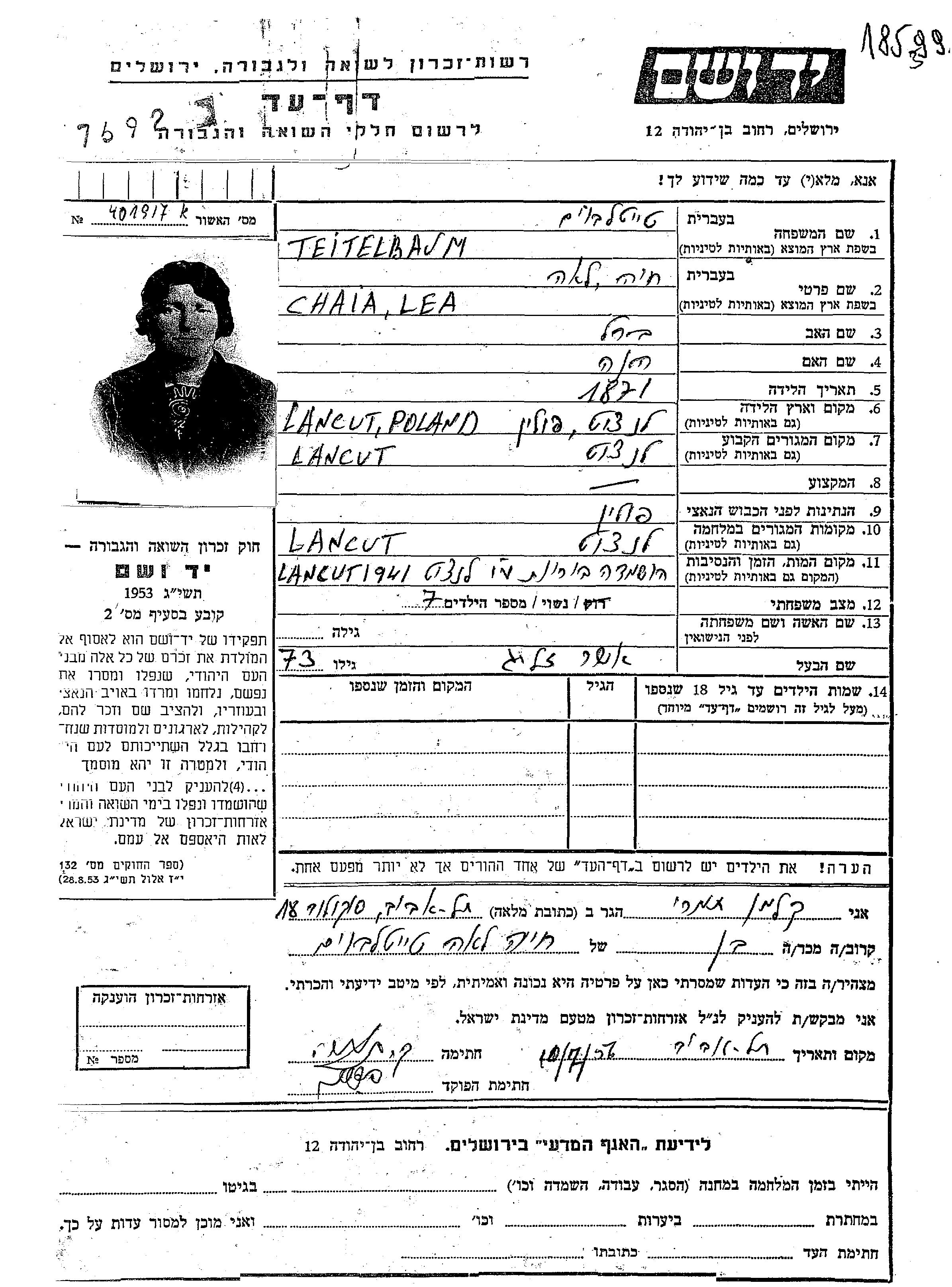 Teitelboim Khaia Lea Lancut, Pologne Feuille de témoignage