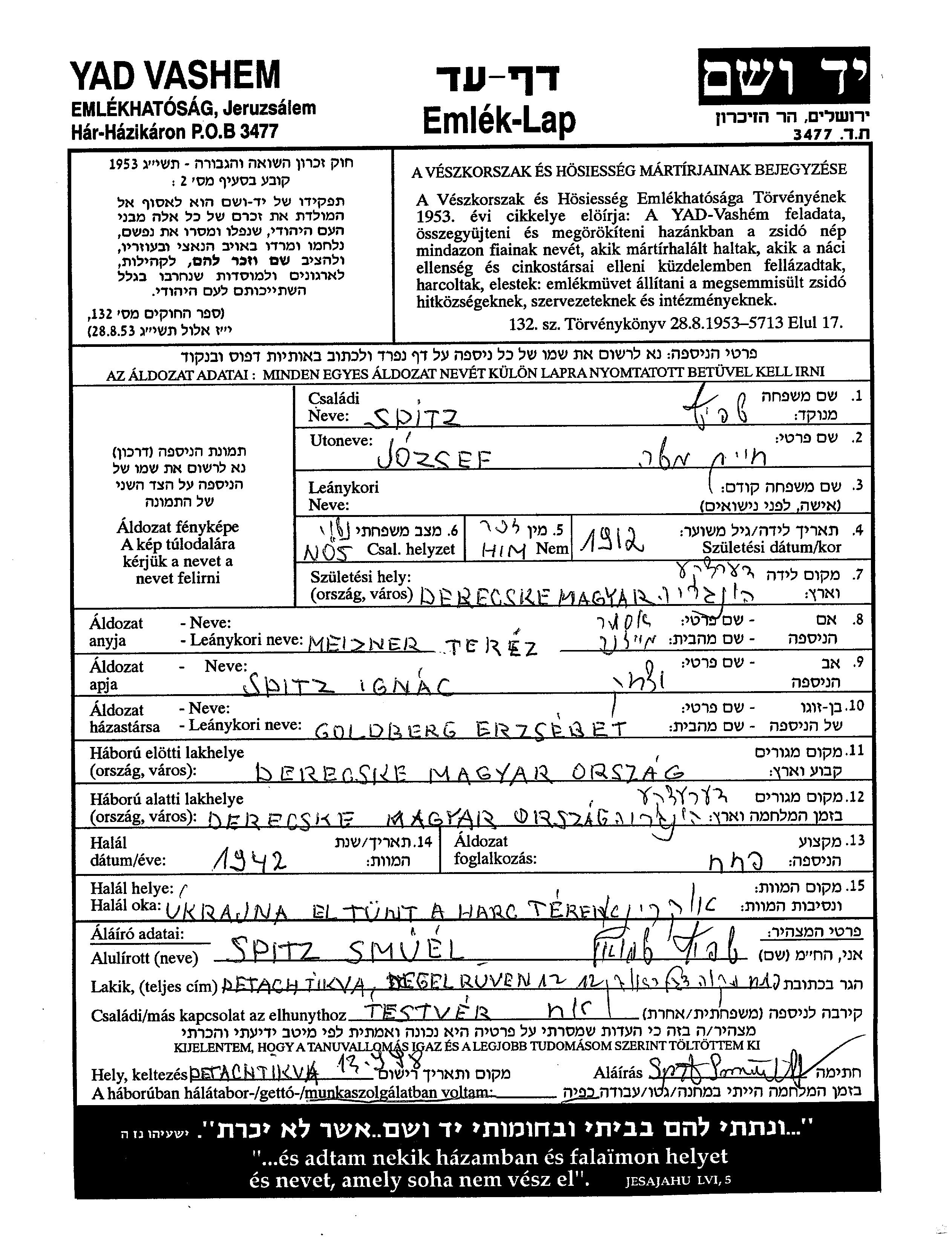 Spitz Jozsef Khaim Moshe 1912 Derecske, Hongrie Feuille de témoignage