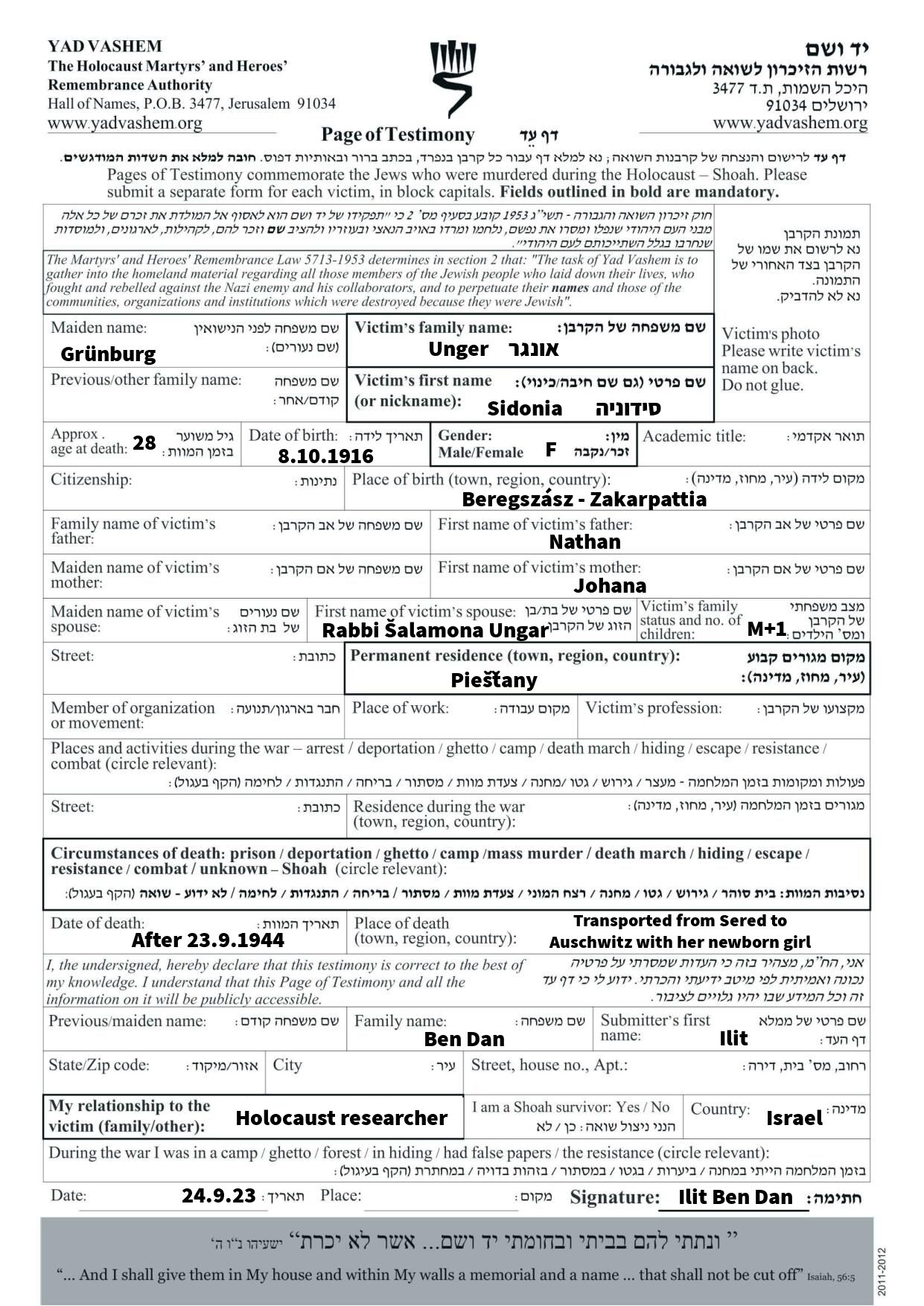 Unger | Sidonia | 1916 | Piestany, Tchécoslovaquie | Feuille de témoignage |