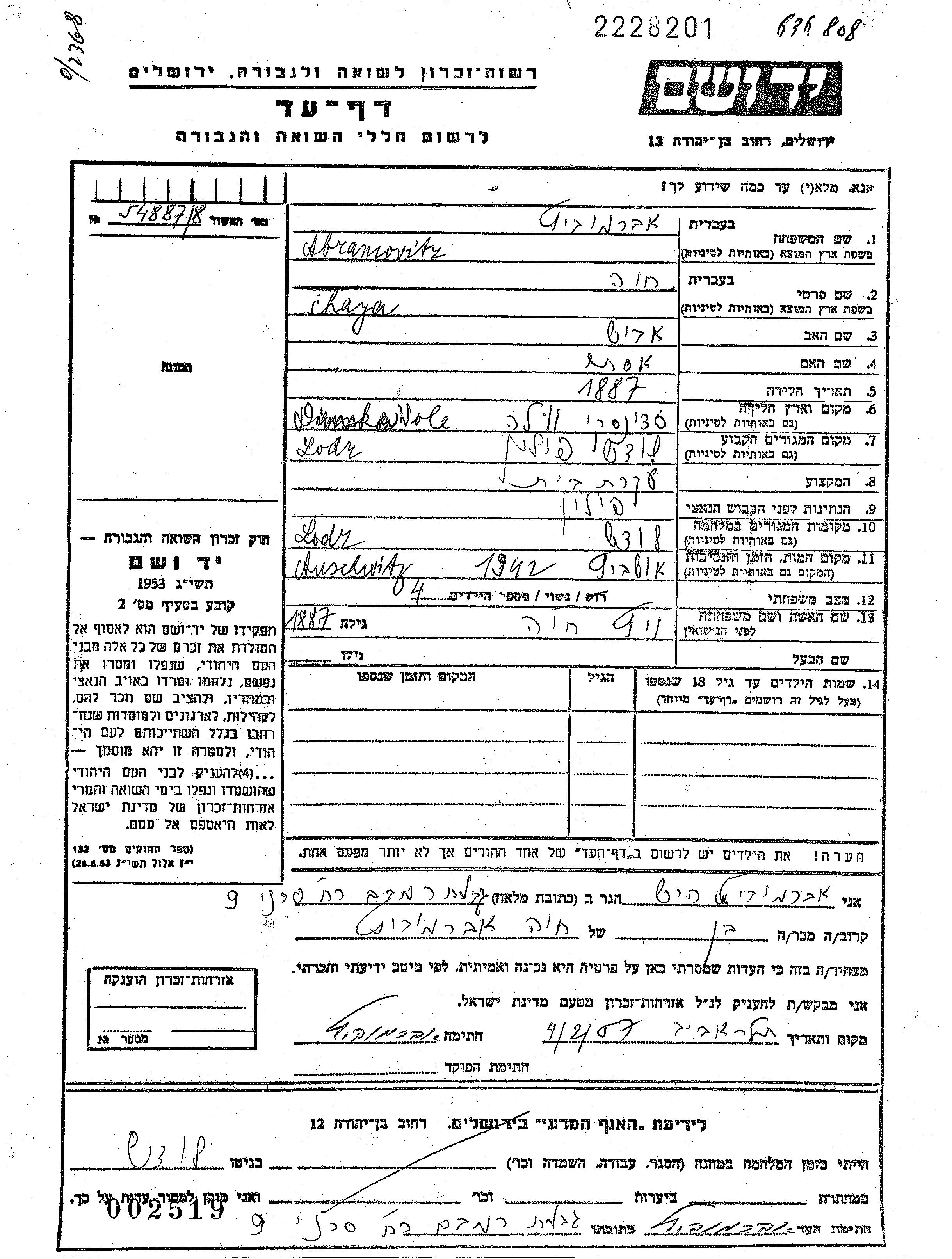 Abramovitz Chaja 1887 Lodz, Pologne Feuille de témoignage