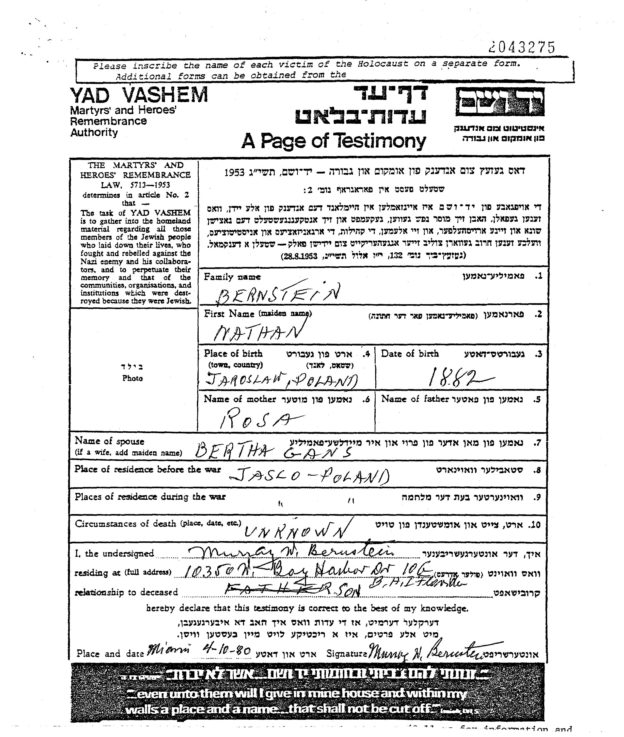 Bernstein Branshtein Natan 1882 Jaslo, Pologne Feuille de témoignage