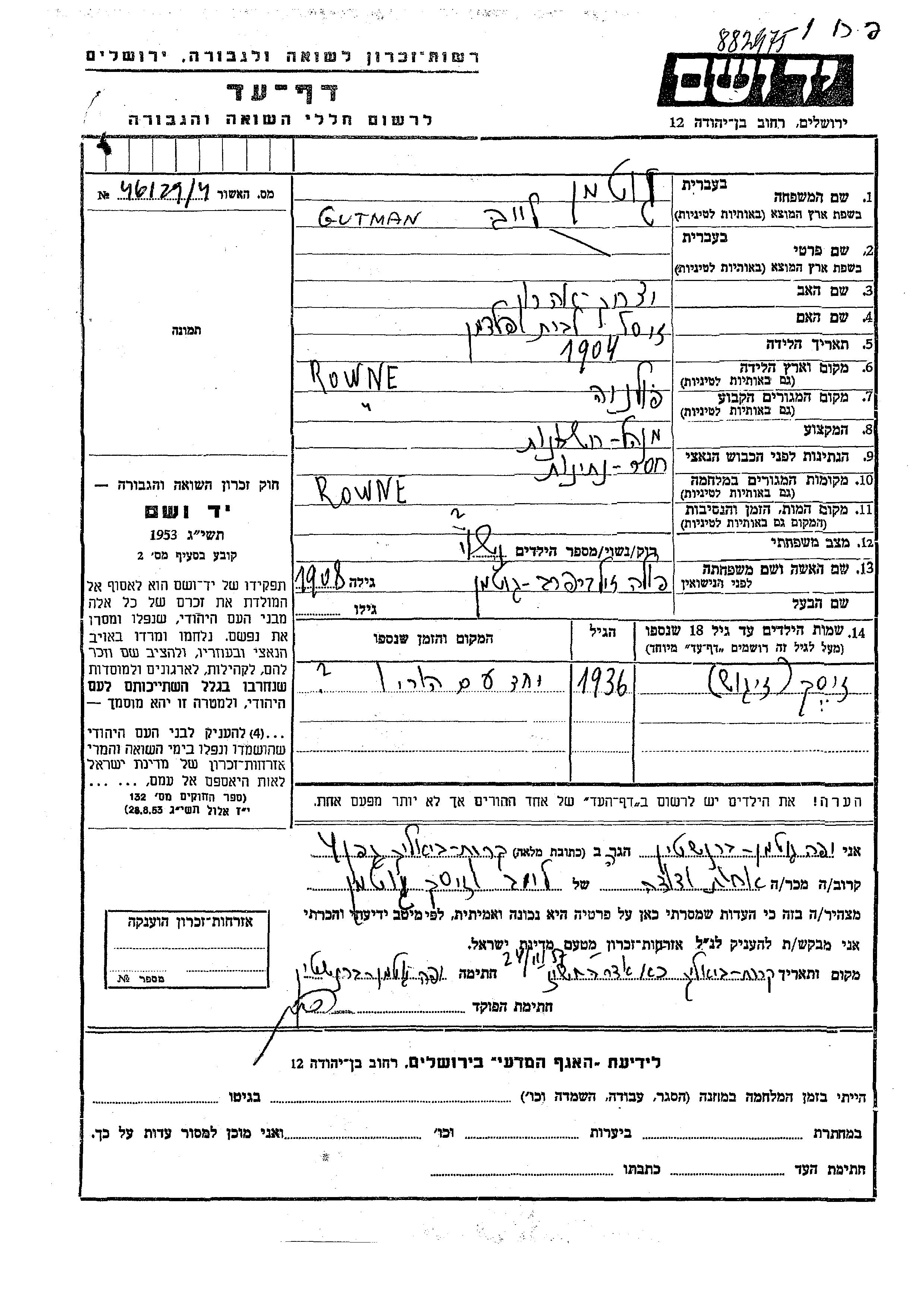 Liowa Leib Liuba Gutman Feldman est né à Rowne, Pologne en 1904. Avant la seconde guerre mondiale il vivait à Rowne, Pologne.
