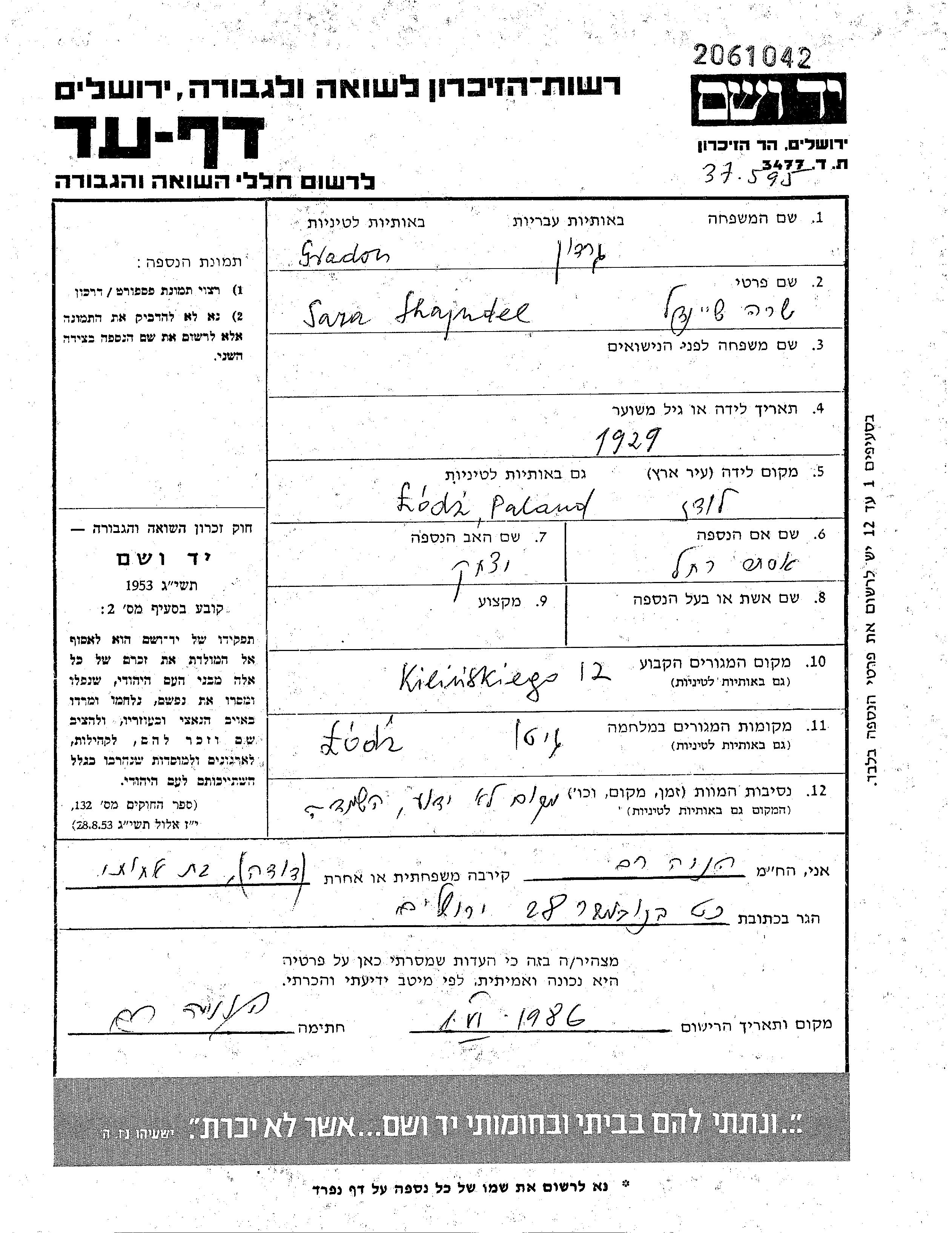 Gradon Shajndel Sara 1929 Lodz, Pologne Feuille de témoignage