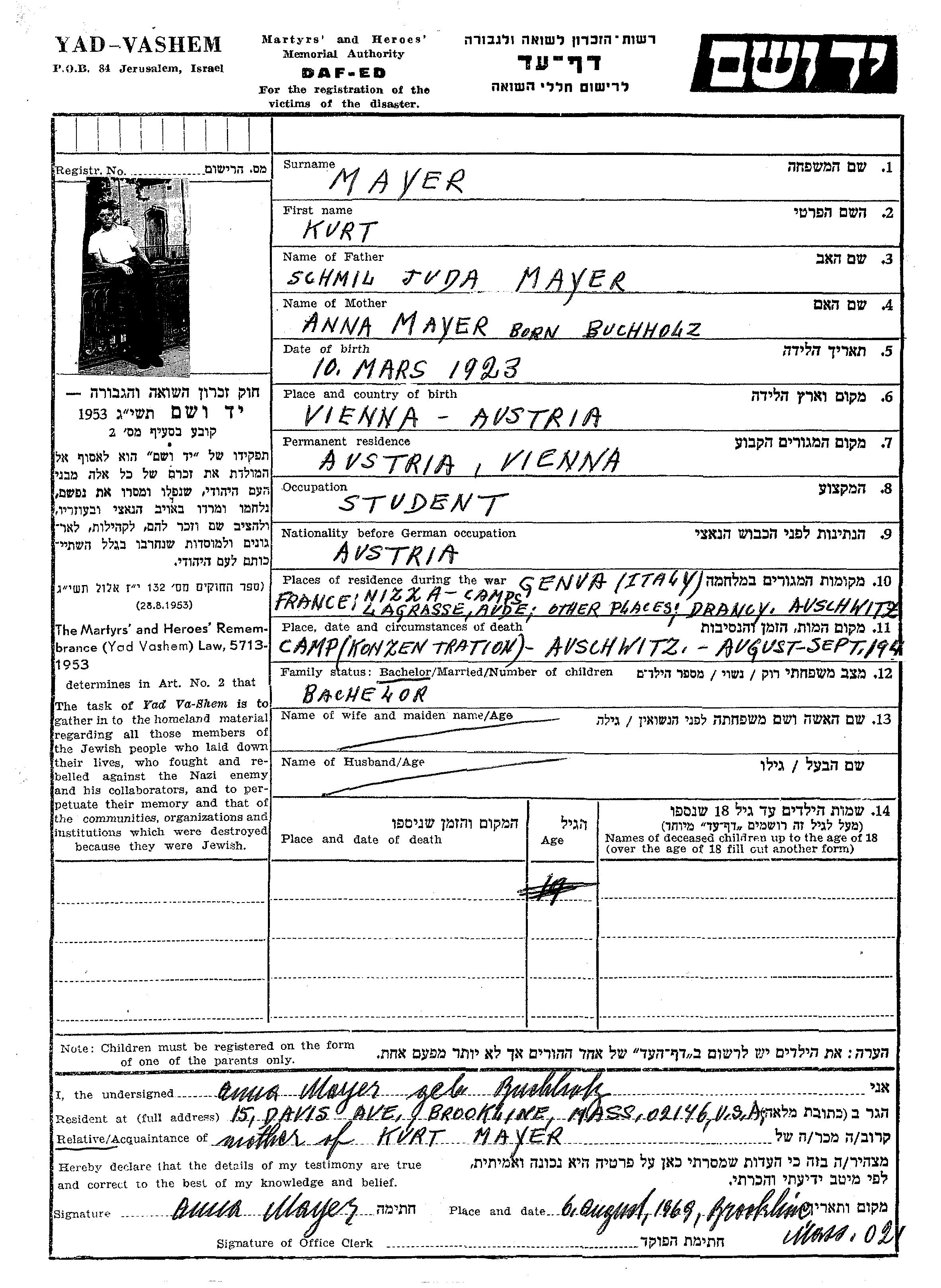 Mayer | Kurt | 1923 | Vienna, Autriche | Feuille de témoignage |