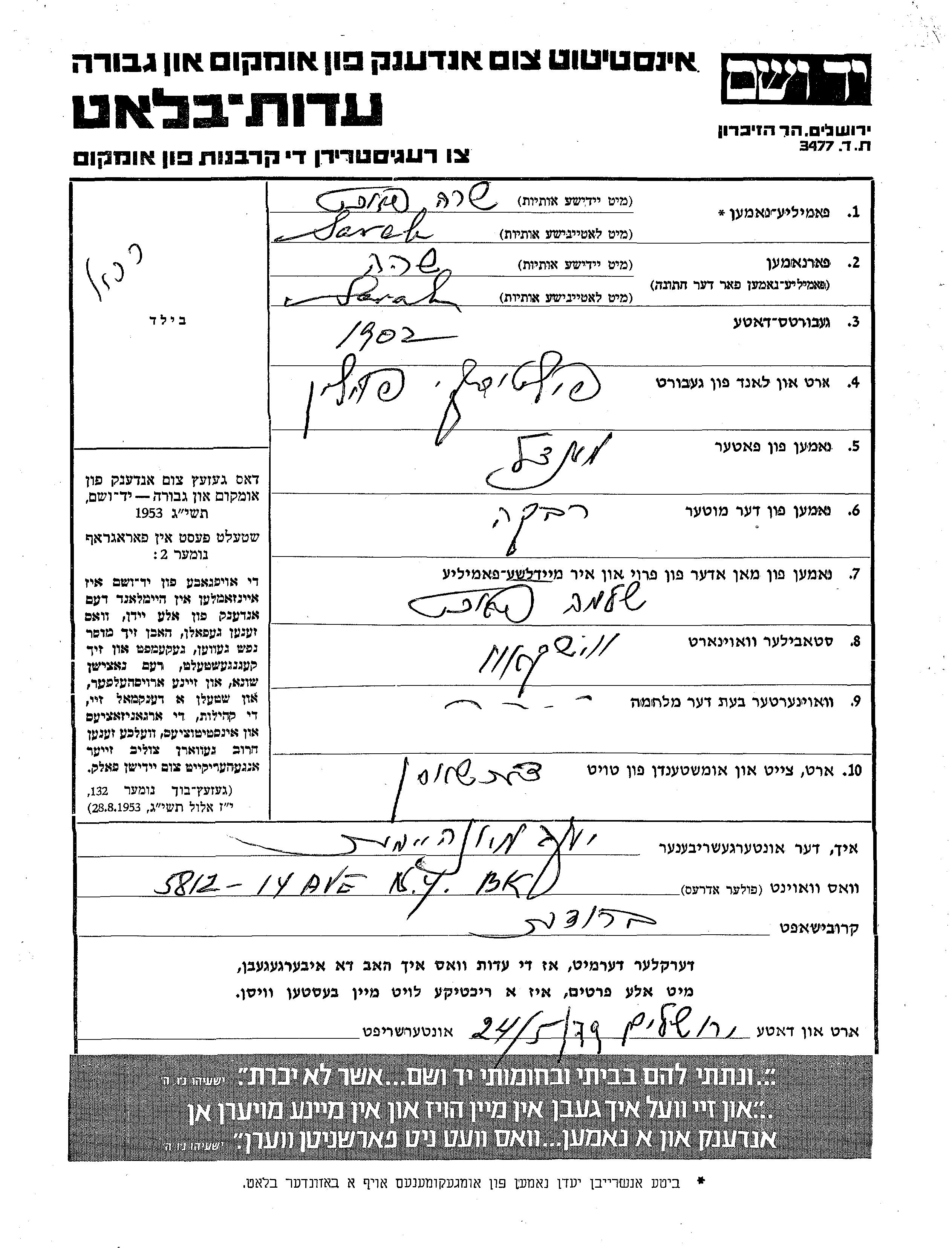 Pekht | Sarah | 1902 | Vishkeve, Pologne | Feuille de témoignage |