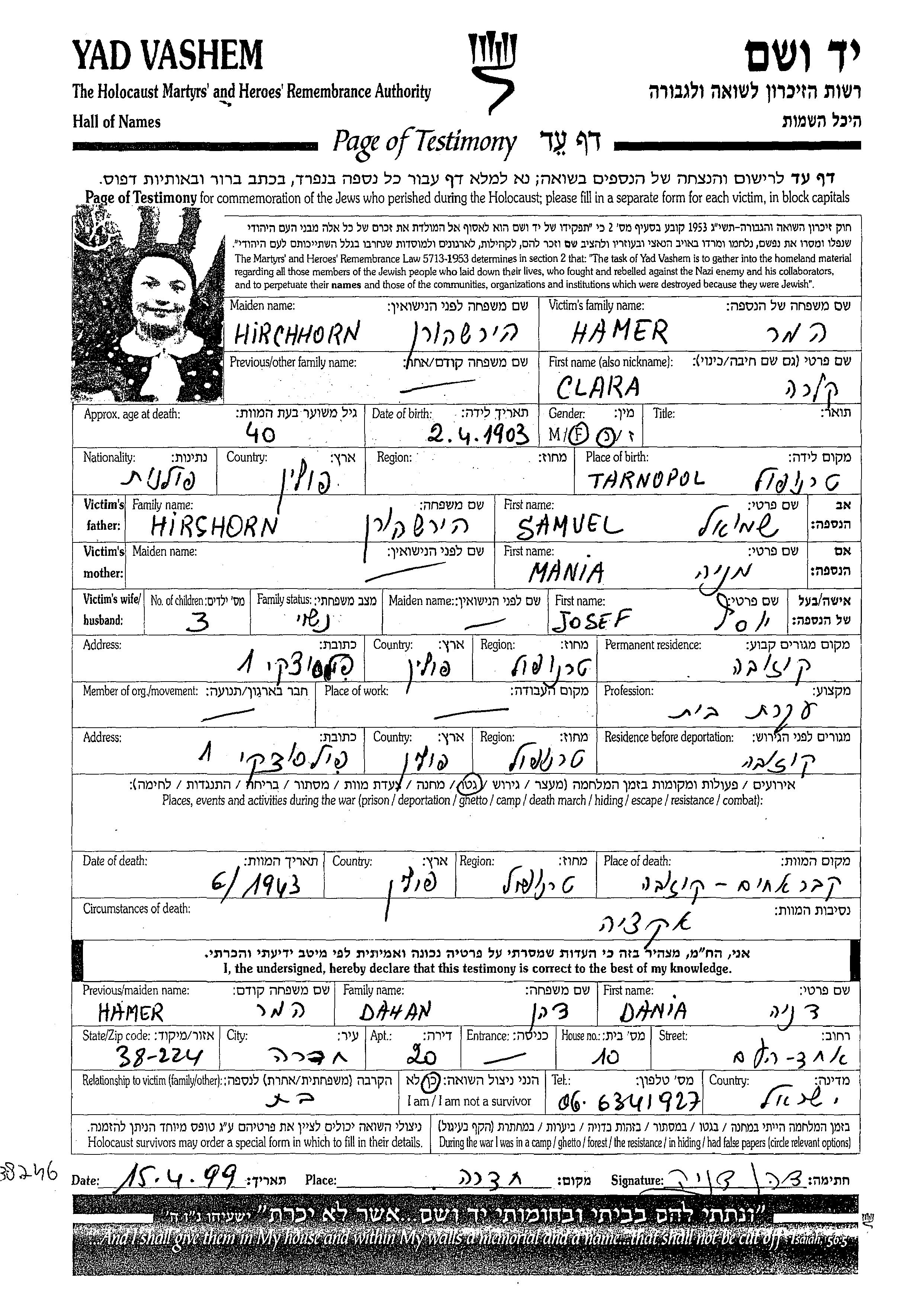 Hamer | Clara | 1903 | Kozowa, Pologne | Feuille de témoignage |