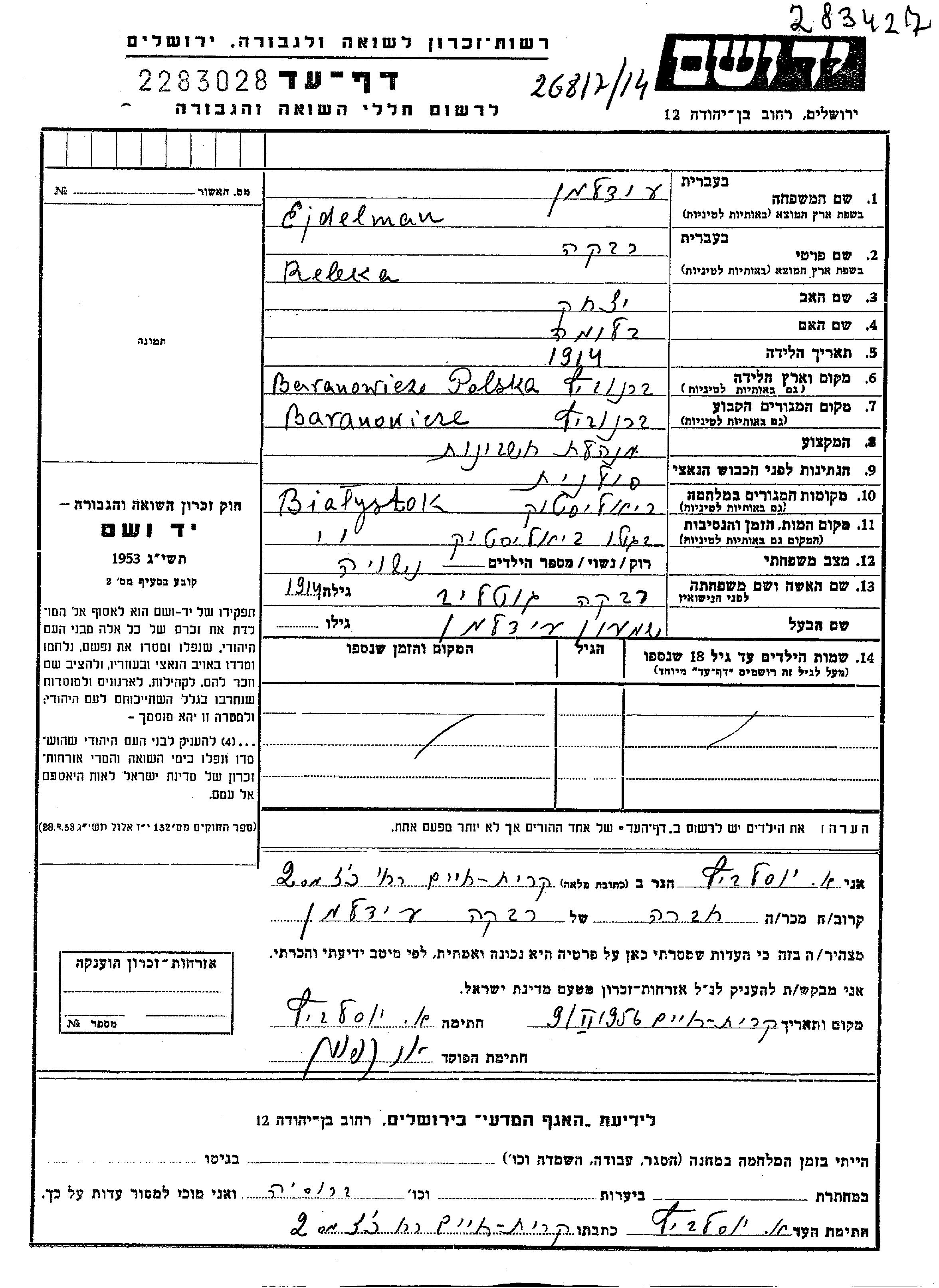 Rivka Ejdelman Gottlieb née Gotlib est née en 1914. Elle était Comptable. Avant la seconde guerre mondiale elle vivait à Baranowicze, Pologne.