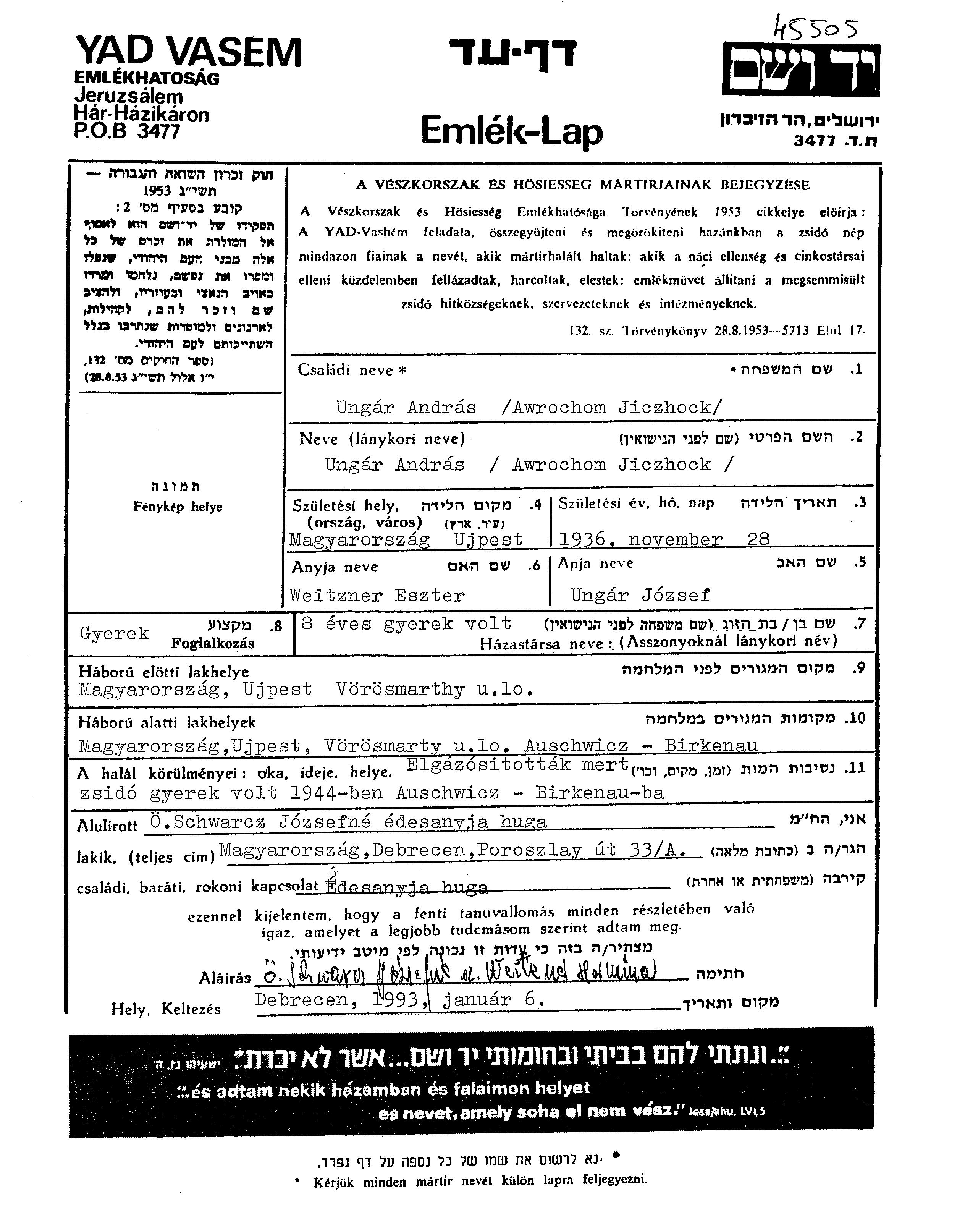 Andras Avraham Yitzkhak Ungar est né à Ujpest, Hongrie en 1936. Il était Élève. Avant la seconde guerre mondiale il vivait à Ujpest, Hongrie.
