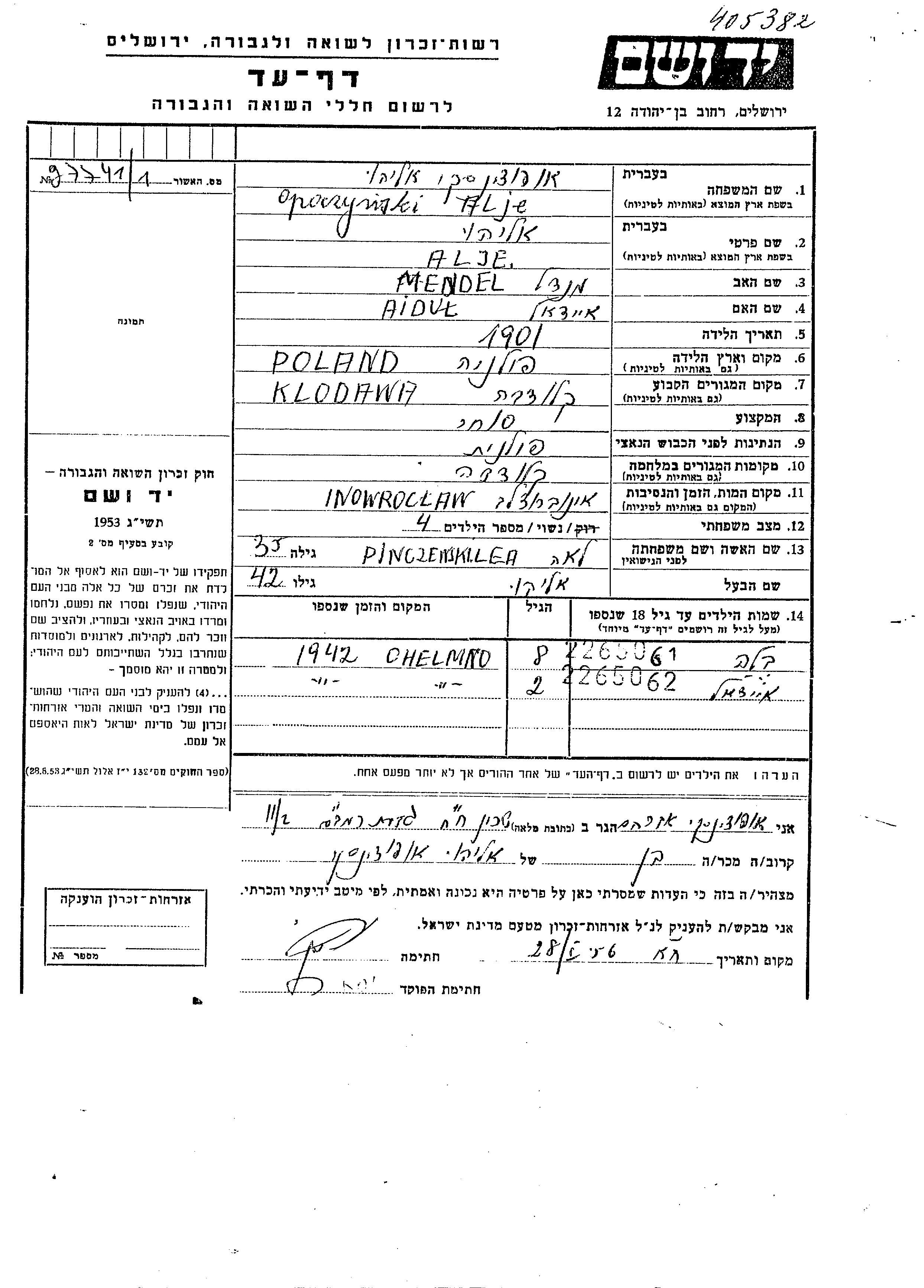 Eliahu Alia Opoczynski est né à Pologne en 1901. Il était Commerçant/e. Avant la seconde guerre mondiale il vivait à Klodawa, Pologne.