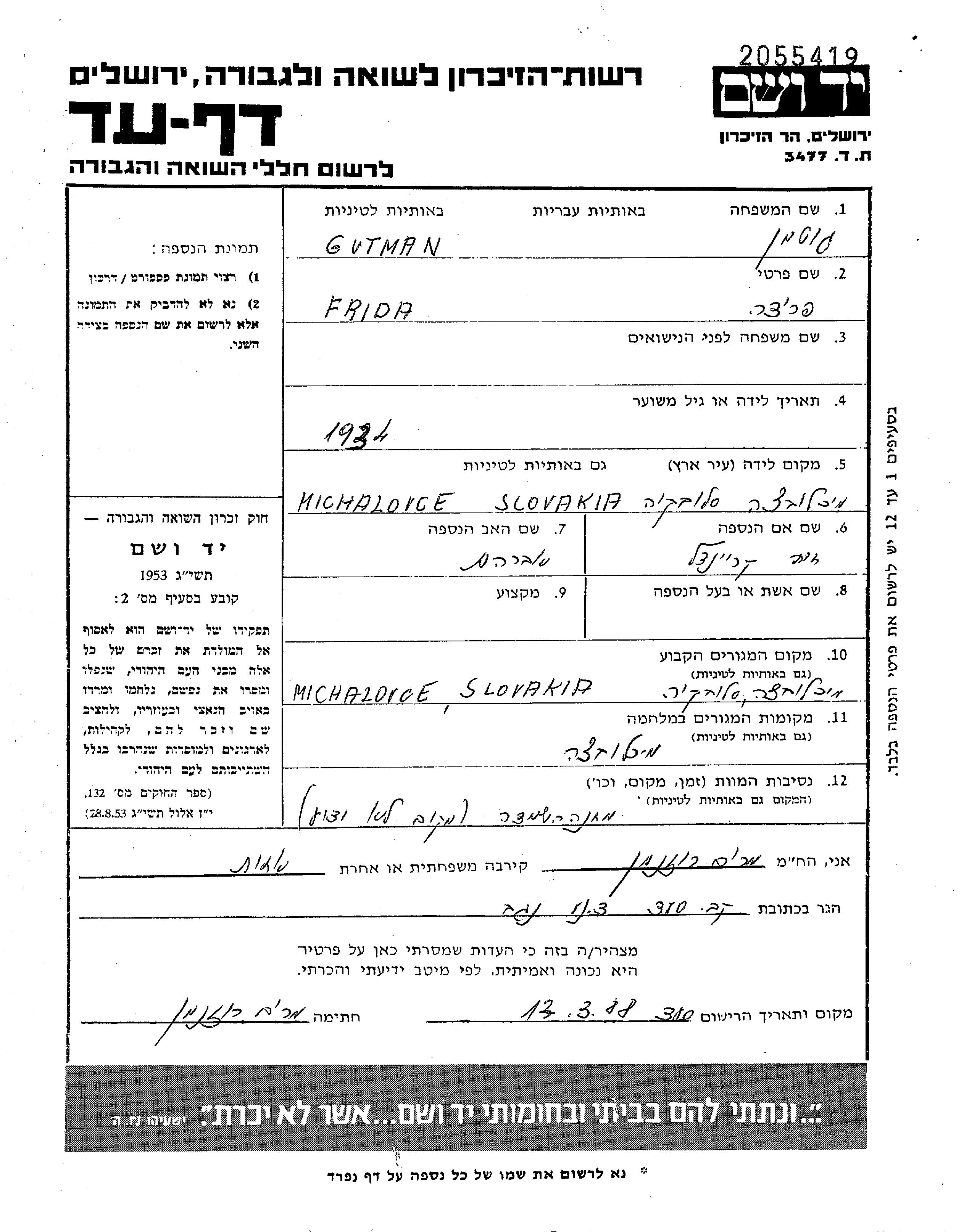 Frida Simkha Gutmann Gotman est née à Michalovce, Tchécoslovaquie en 1934. Avant la seconde guerre mondiale elle vivait à Michalovce, Tchécoslovaquie.