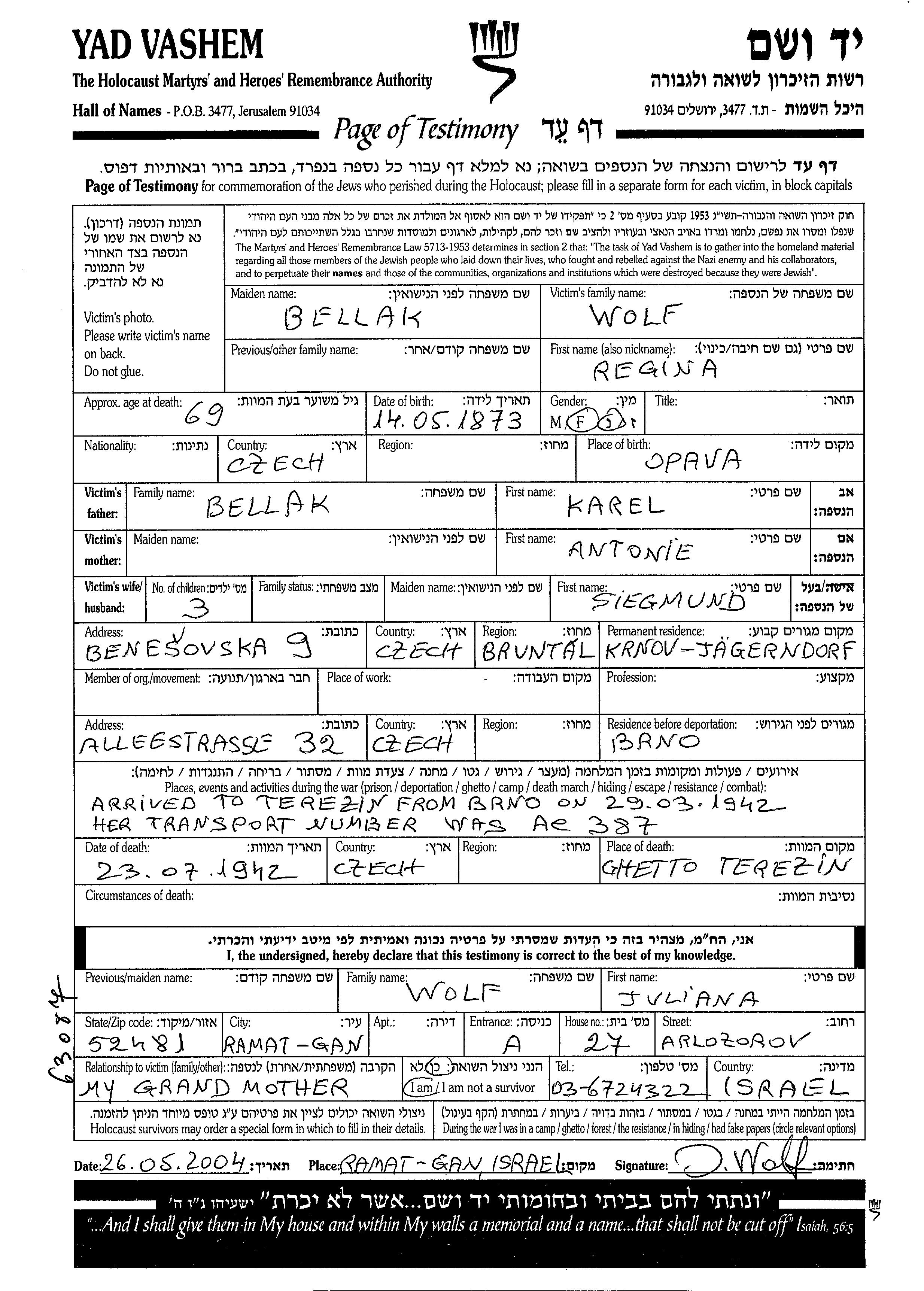 | Wolf | Regina | 1873 | Krnov, Tchécoslovaquie | Feuille de témoignage |