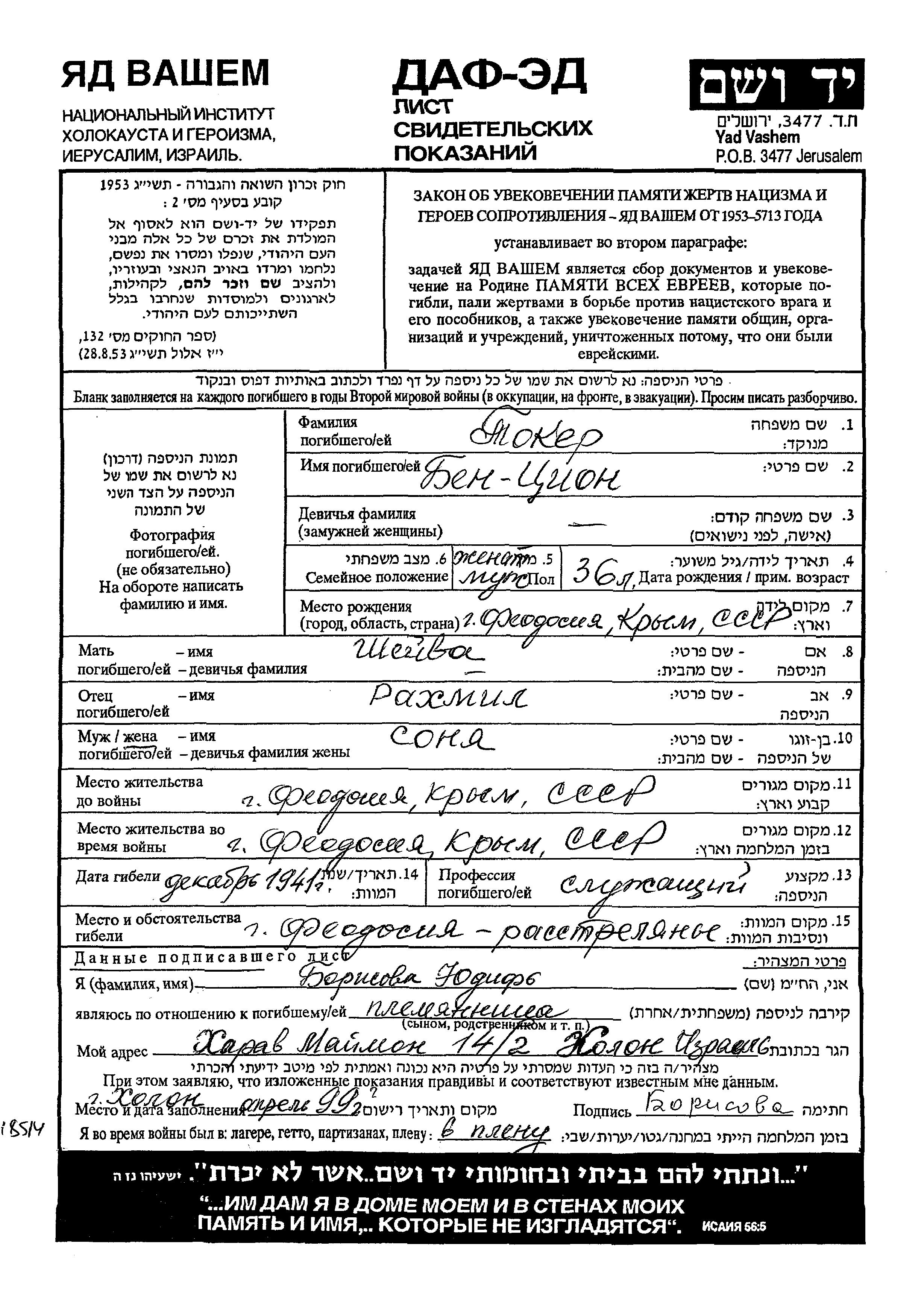 Toker Ben Tzion Feodosiya, Russie (URSS) Feuille de témoignage