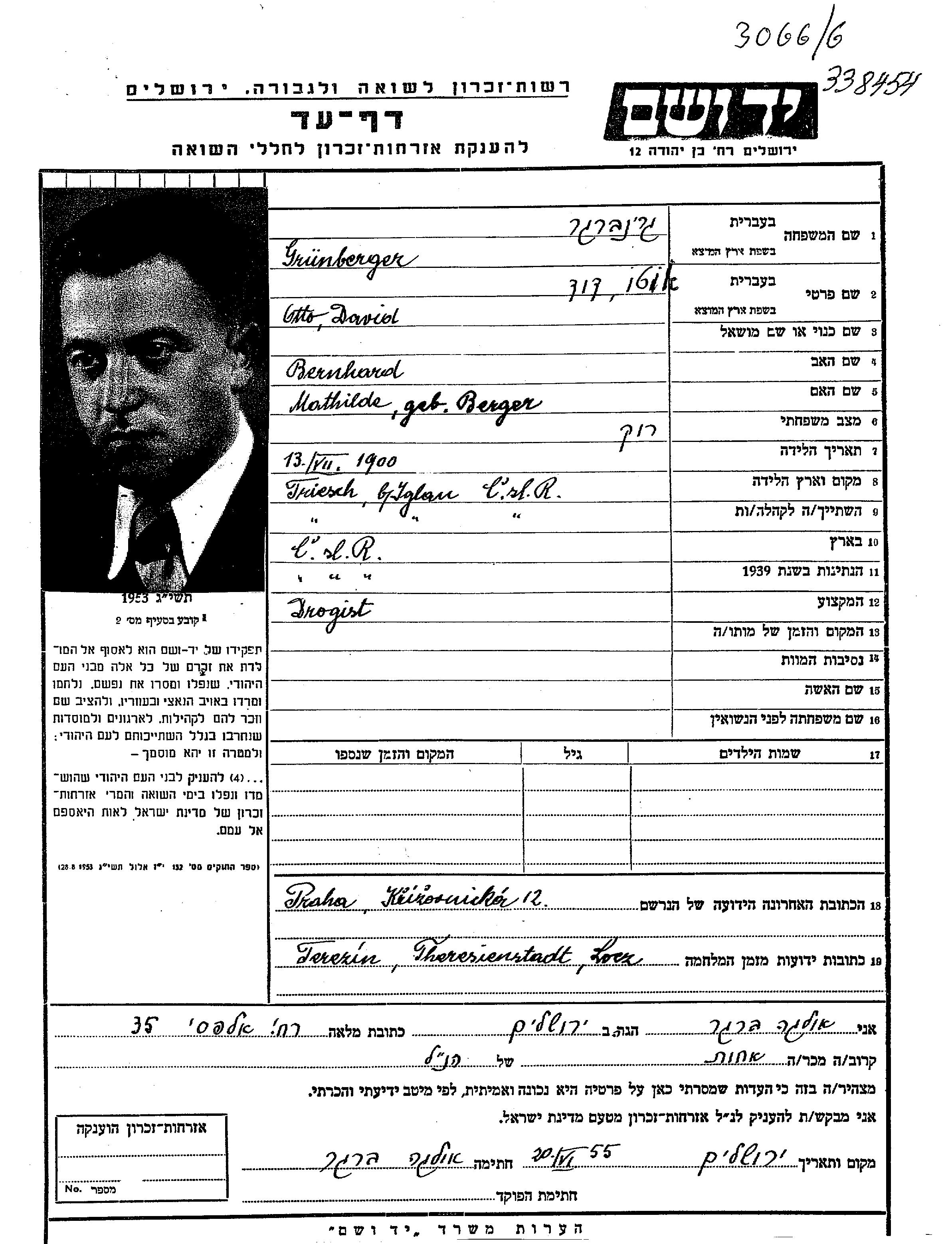 Oto David Gruenberger est né à Triesch, Tchécoslovaquie en 1900. Avant la seconde guerre mondiale il vivait à Prague, Tchécoslovaquie.
