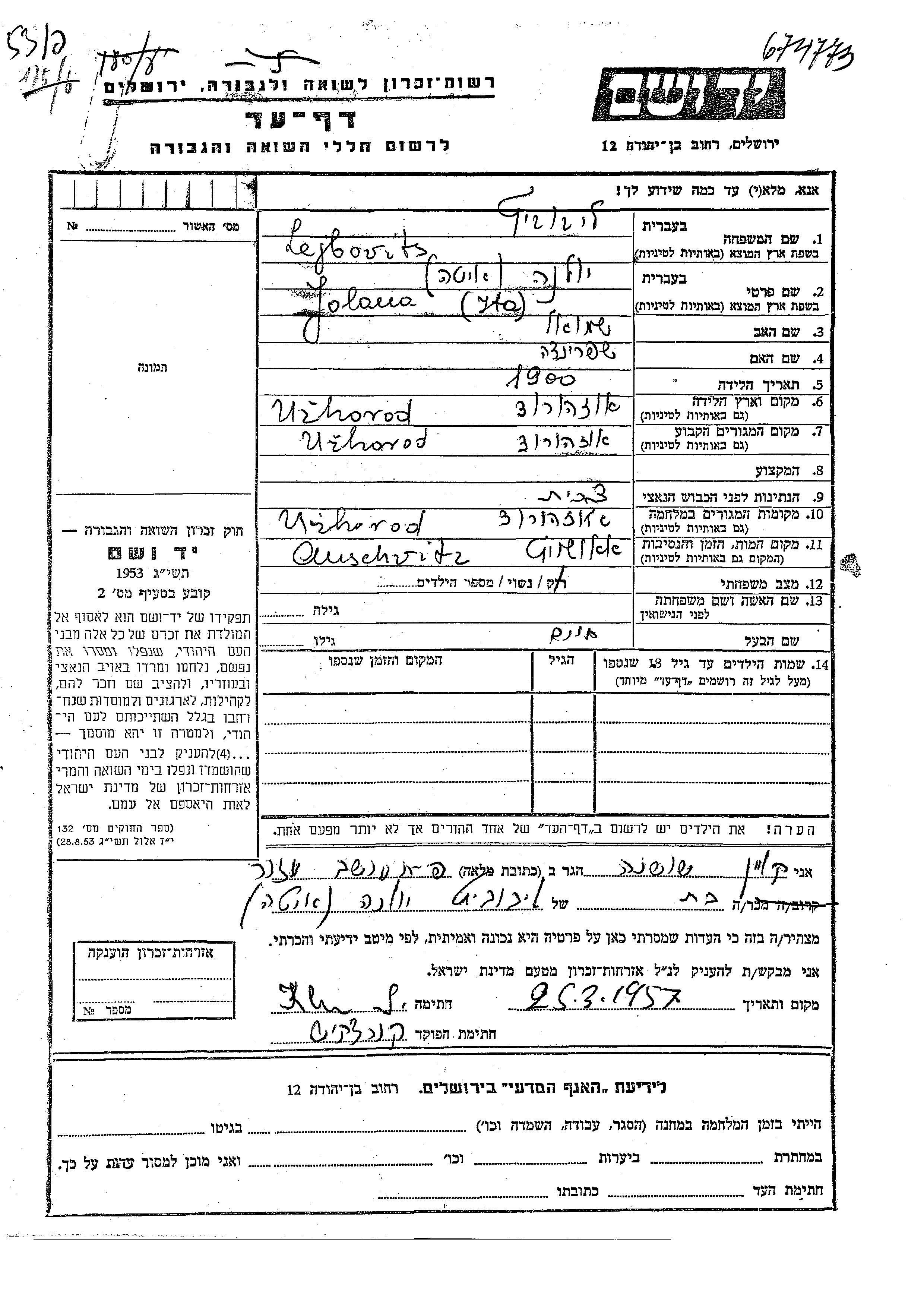 Lejbovitz Yolana Ita 1900 Uzhorod, Tchécoslovaquie Feuille de témoignage
