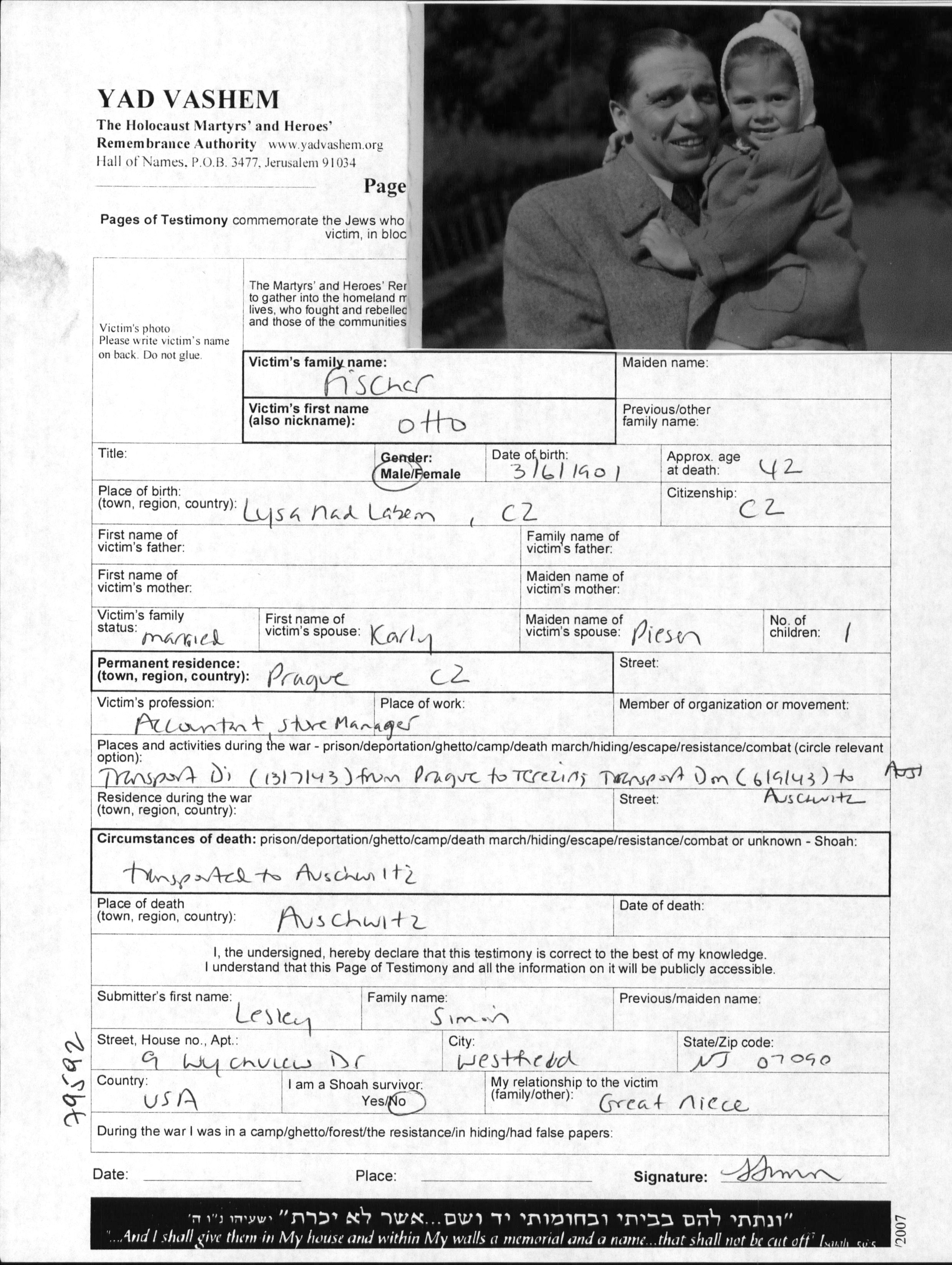 Fischer Otto 1901 Prague, Tchécoslovaquie Feuille de témoignage