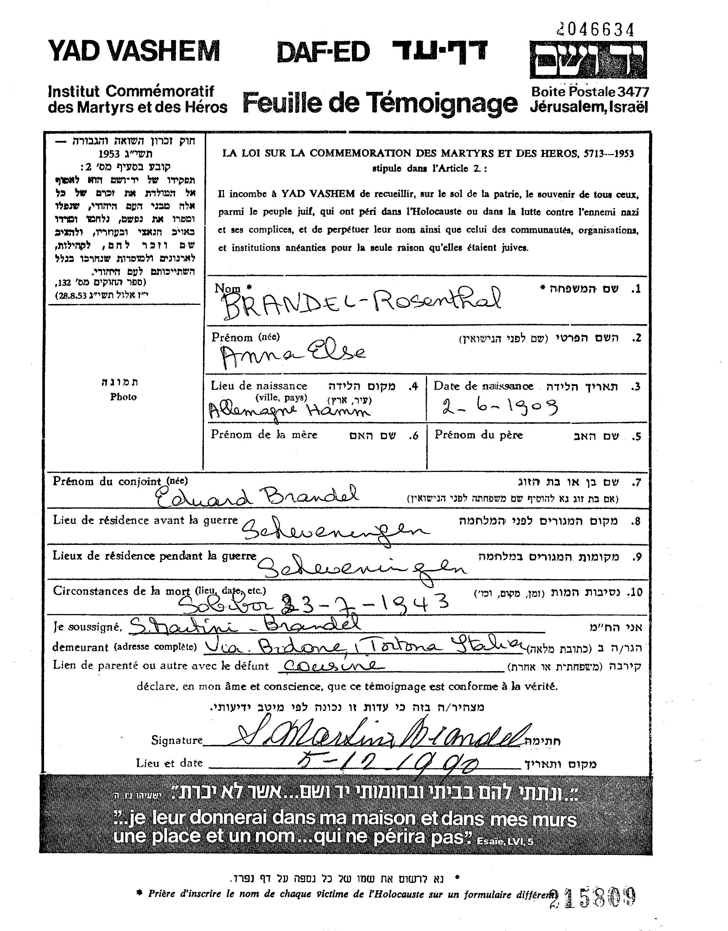 Else Ana Brandel née Rosenthal est née à Hamm, Allemagne en 1909. Avant la seconde guerre mondiale elle vivait à Scheveningen, Pays-Bas.