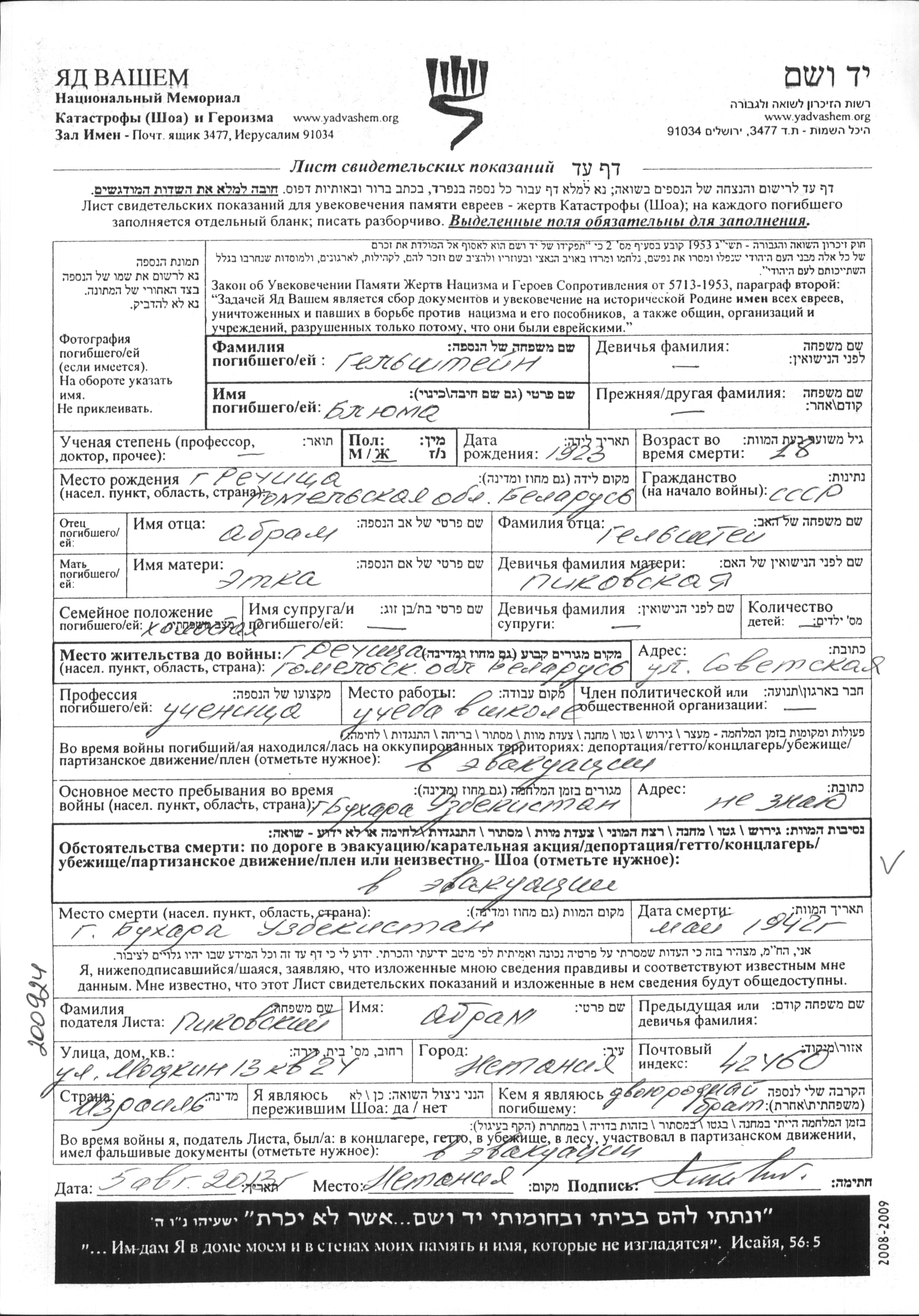 Gelshteyn Blyuma 1923 Rechitsa, Bélorussie (URSS) Feuille de témoignage
