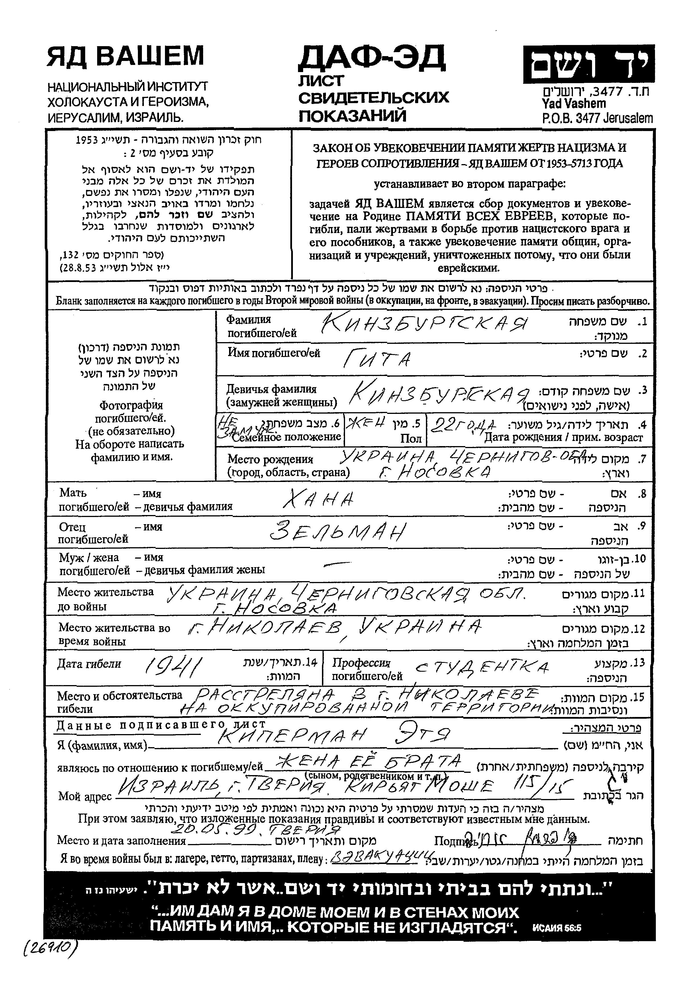 Kinzburgski Gita 1919 Nosovka, Ukraine (URSS) Feuille de témoignage