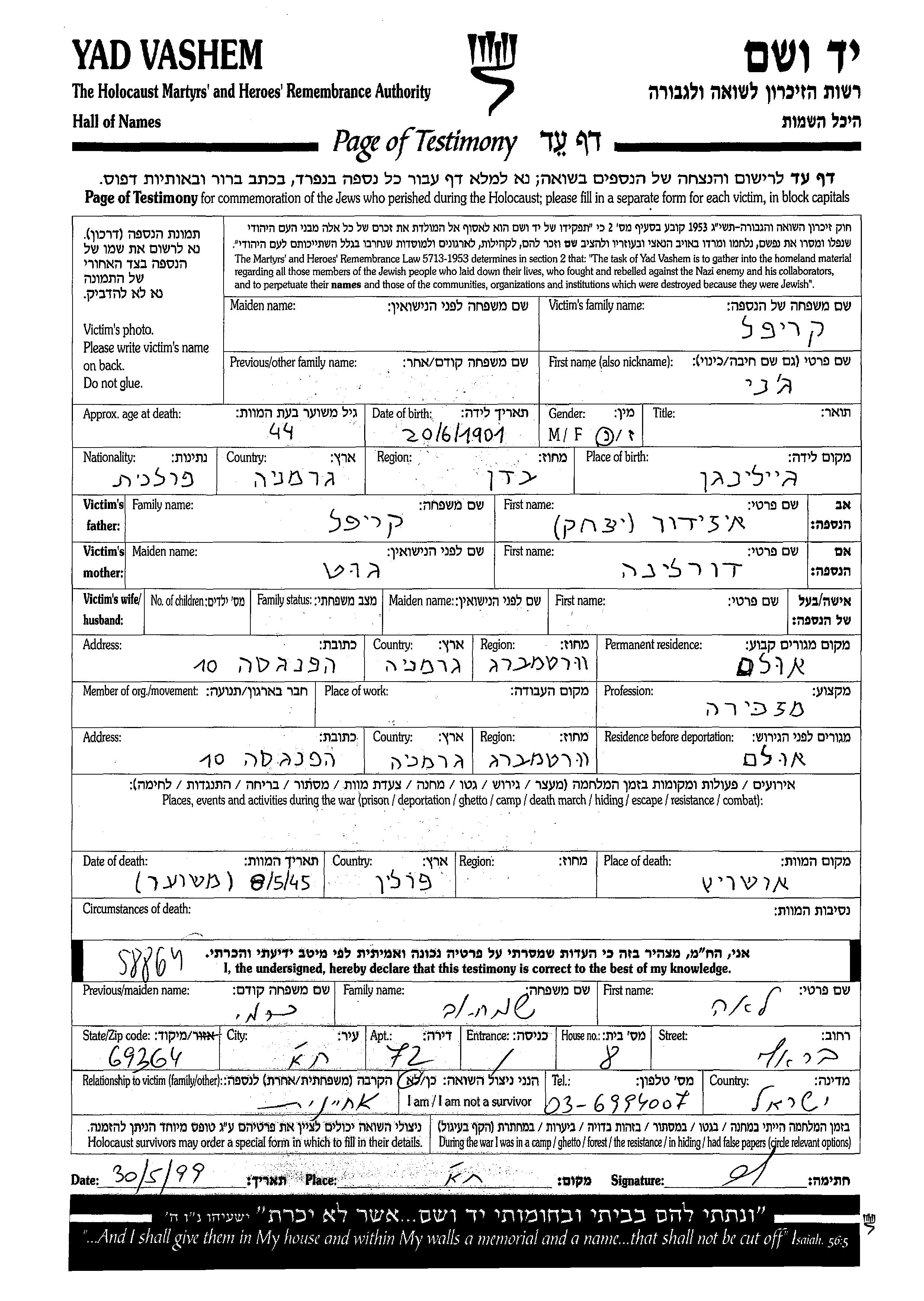 Yad Vashem - Pages of Testimony Names Memorial Collection