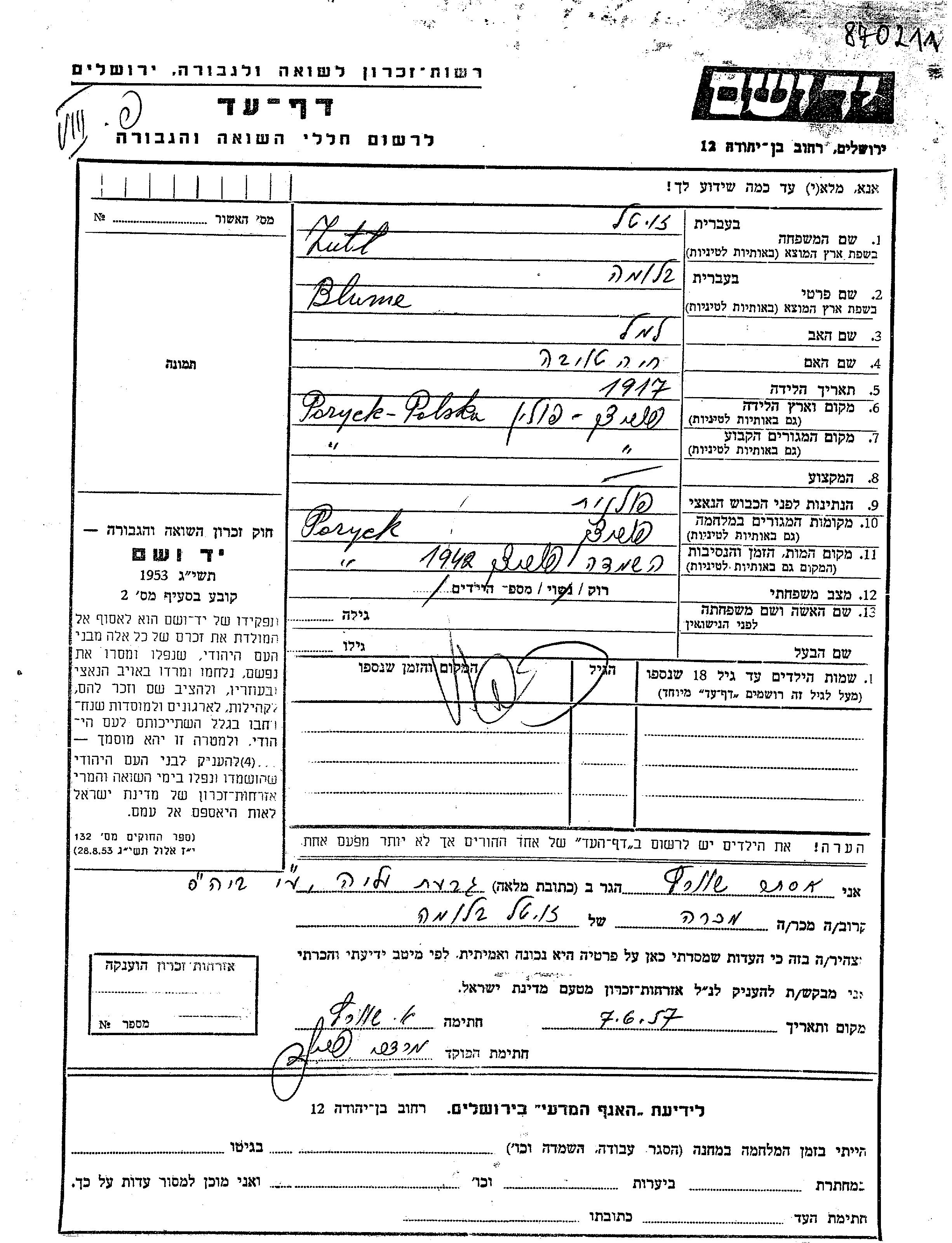 Bluma a été assassinée pendant la Shoah. Lieu de la mort: Poryck, Pologne en 1942.