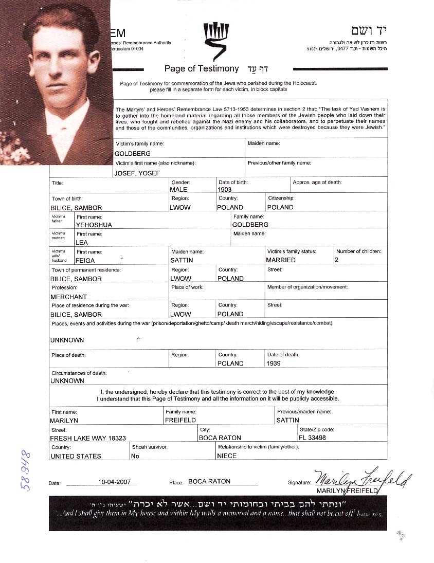 Goldberg Josef 1903 Bilice, Pologne Feuille de témoignage