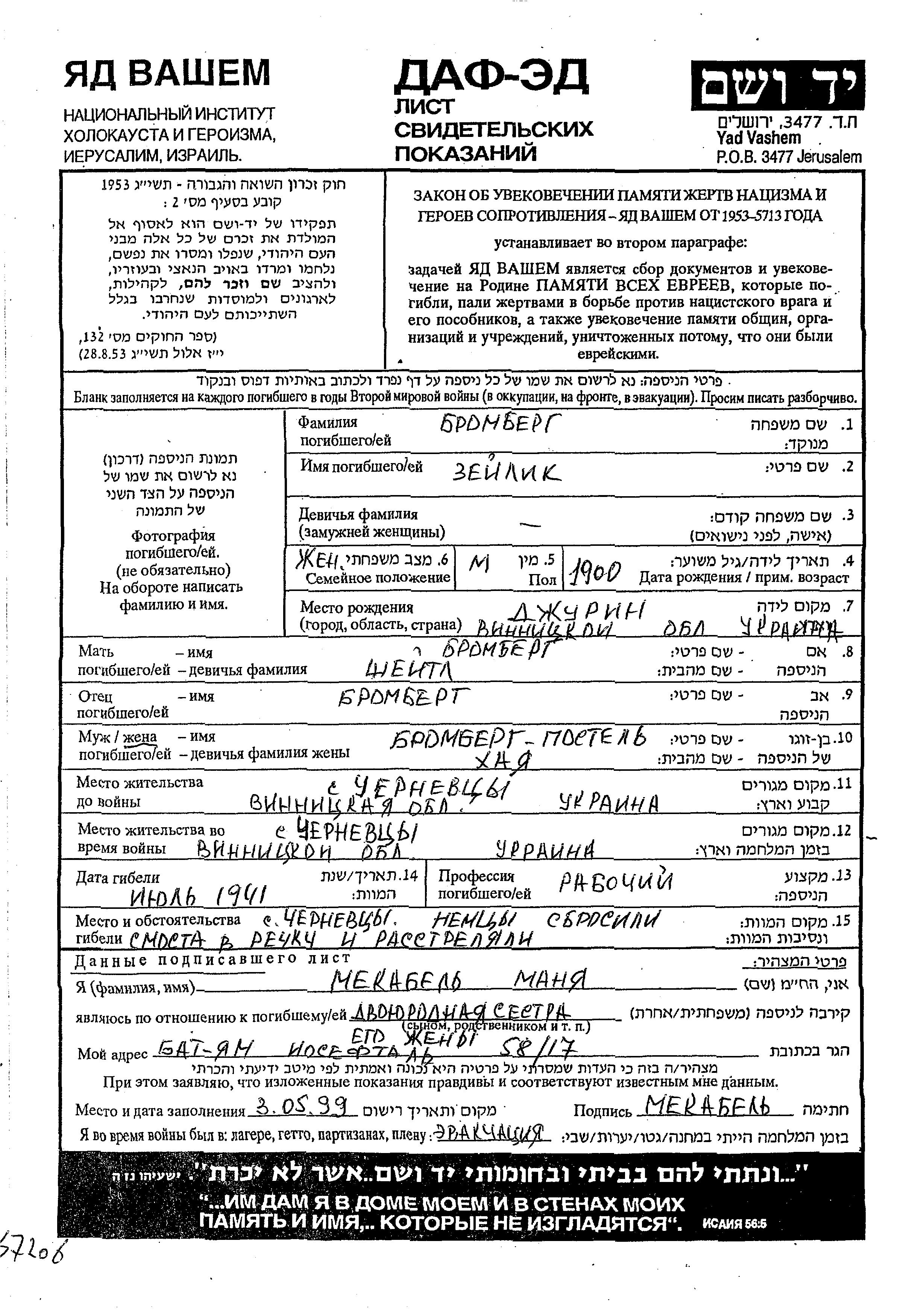 Zeilik Bromberg est né à Dzhurin, Ukraine (URSS) en 1900. Il était Ouvrier/e. Avant la seconde guerre mondiale il vivait à Chernevtsi, Ukraine (URSS).