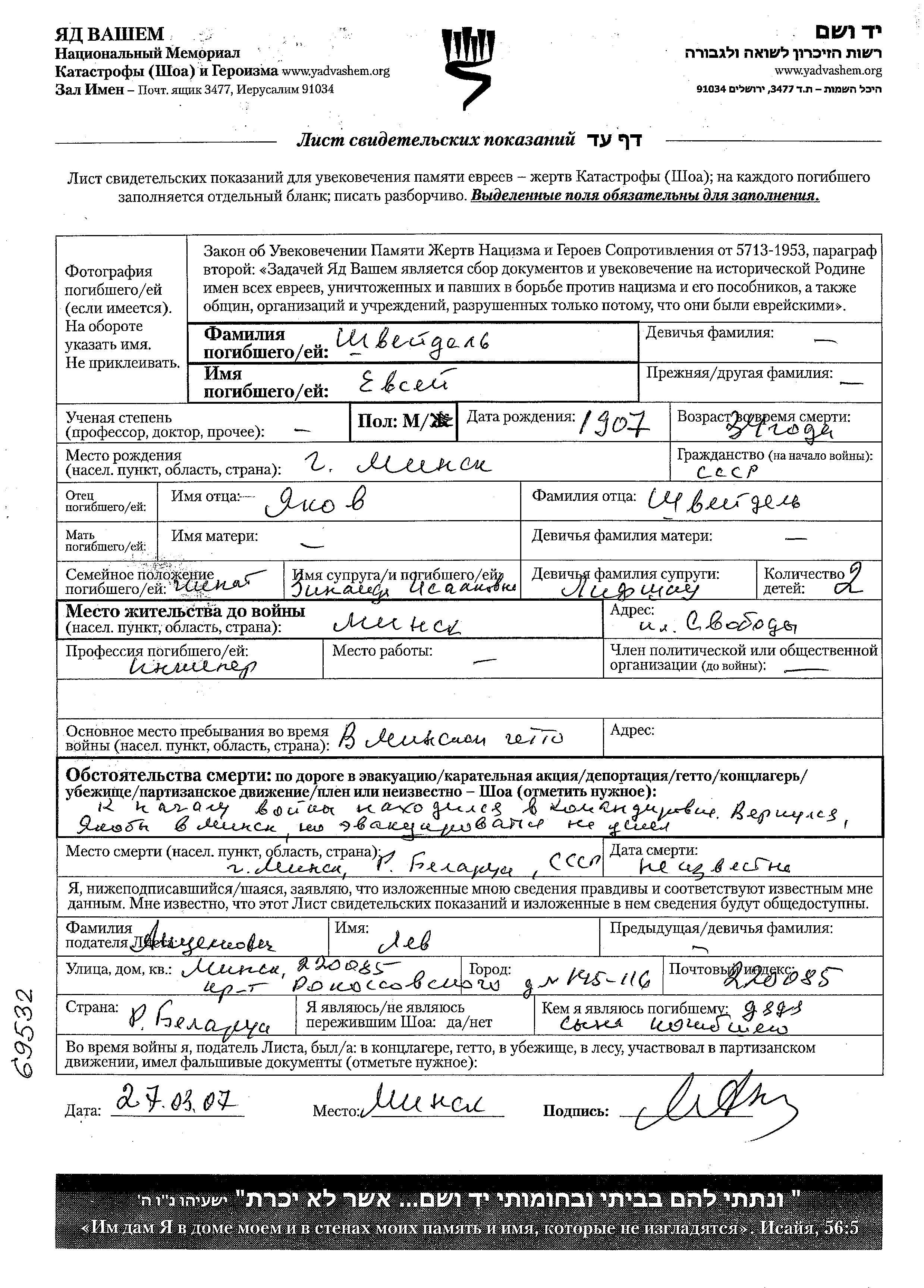 Shveydel Yevsey 1907 Minsk, Bélorussie (URSS) Feuille de témoignage