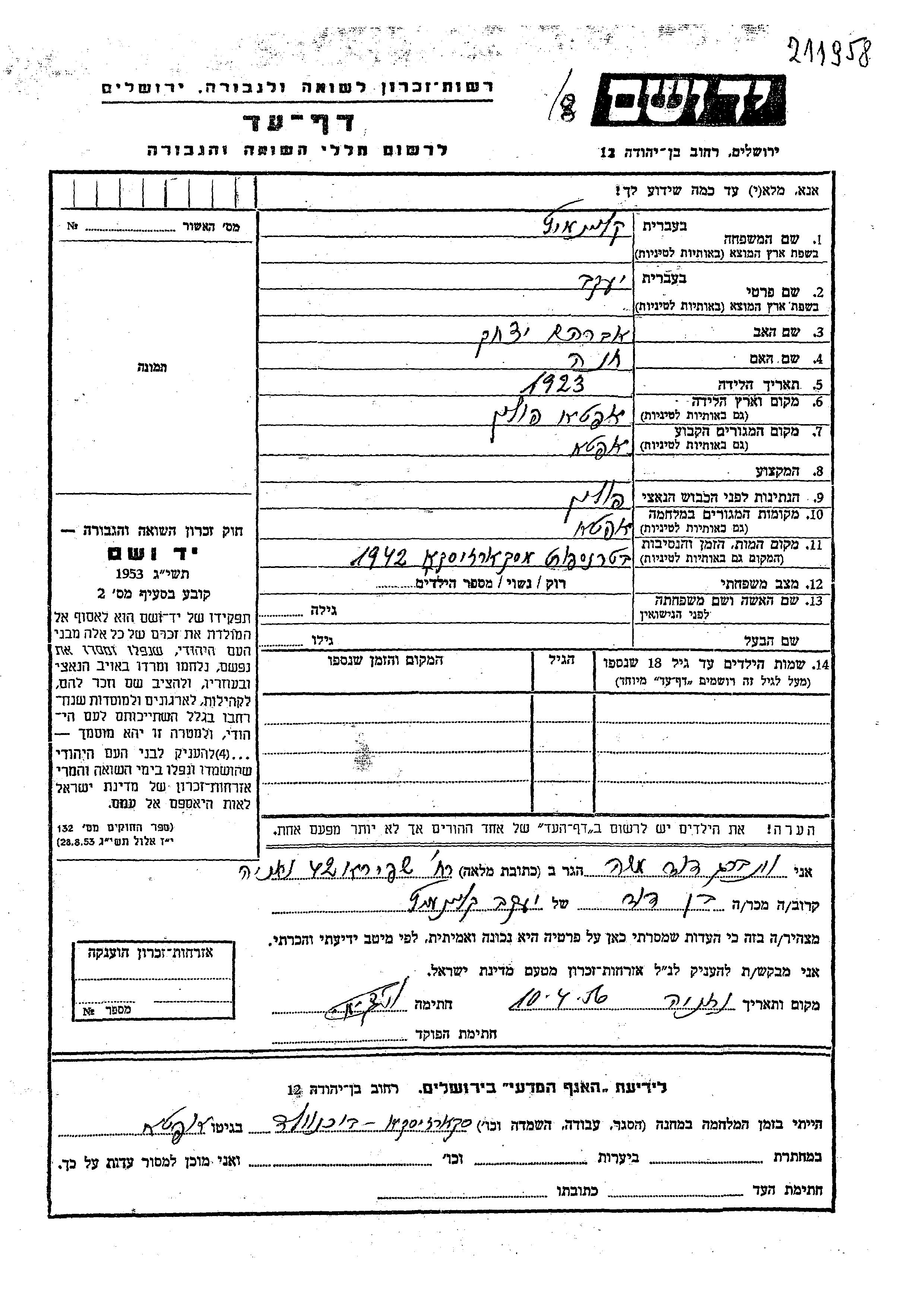 Kleimitz Yaakov 1923 Apta, Pologne Feuille de témoignage
