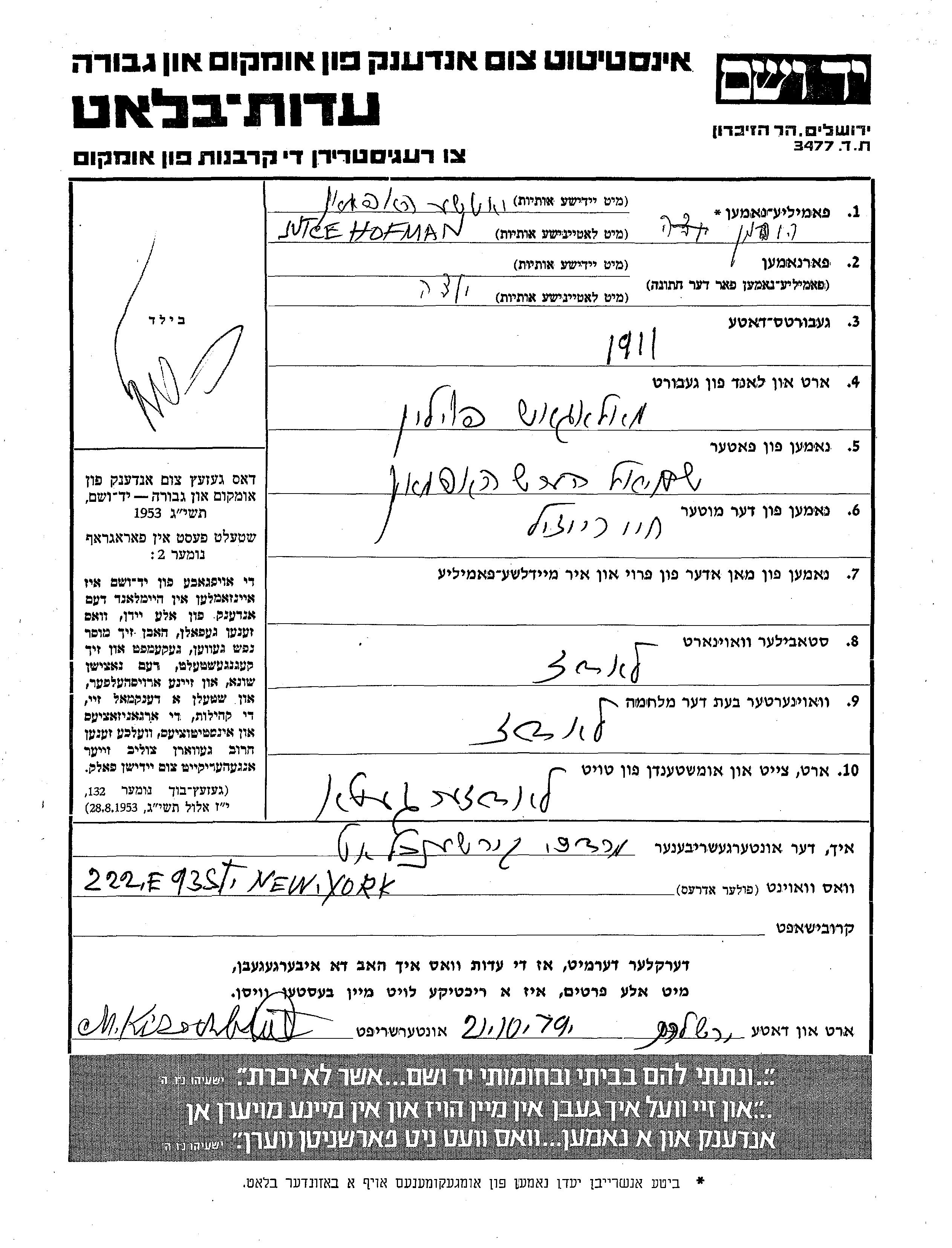 Hoffman | Jutcha Yutcha | 1911 | Lodz, Pologne | Feuille de témoignage |