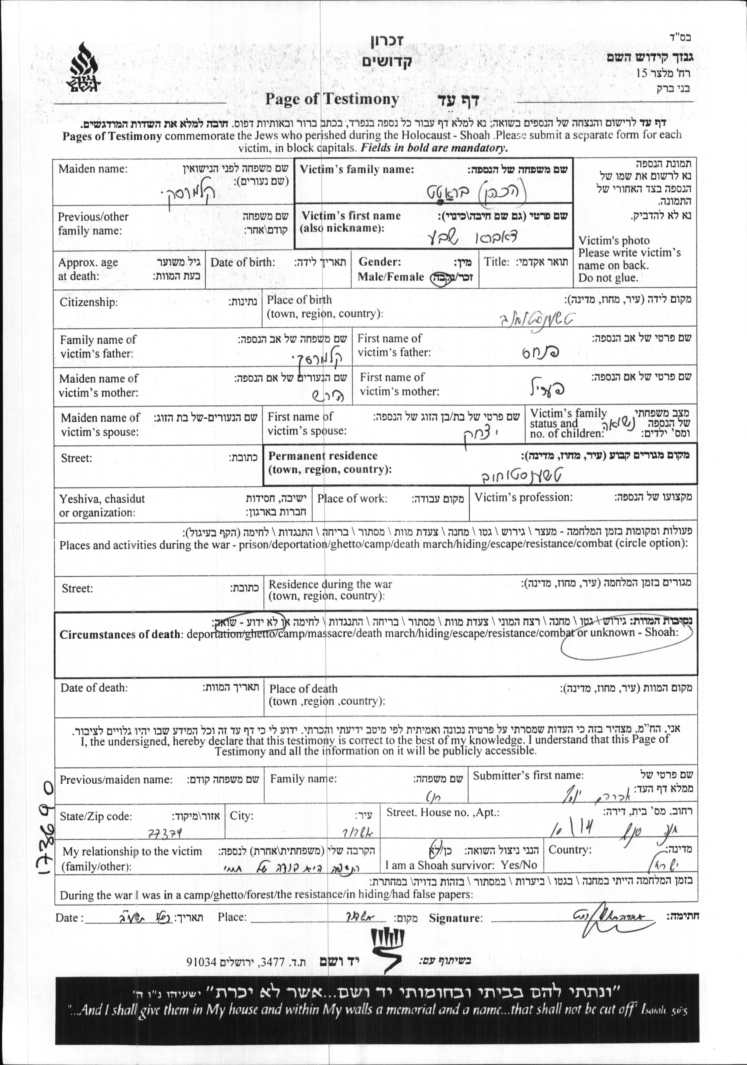 Bratt Hacohen | Davra Sheva | Czenstochowa, Pologne | Feuille de témoignage | |