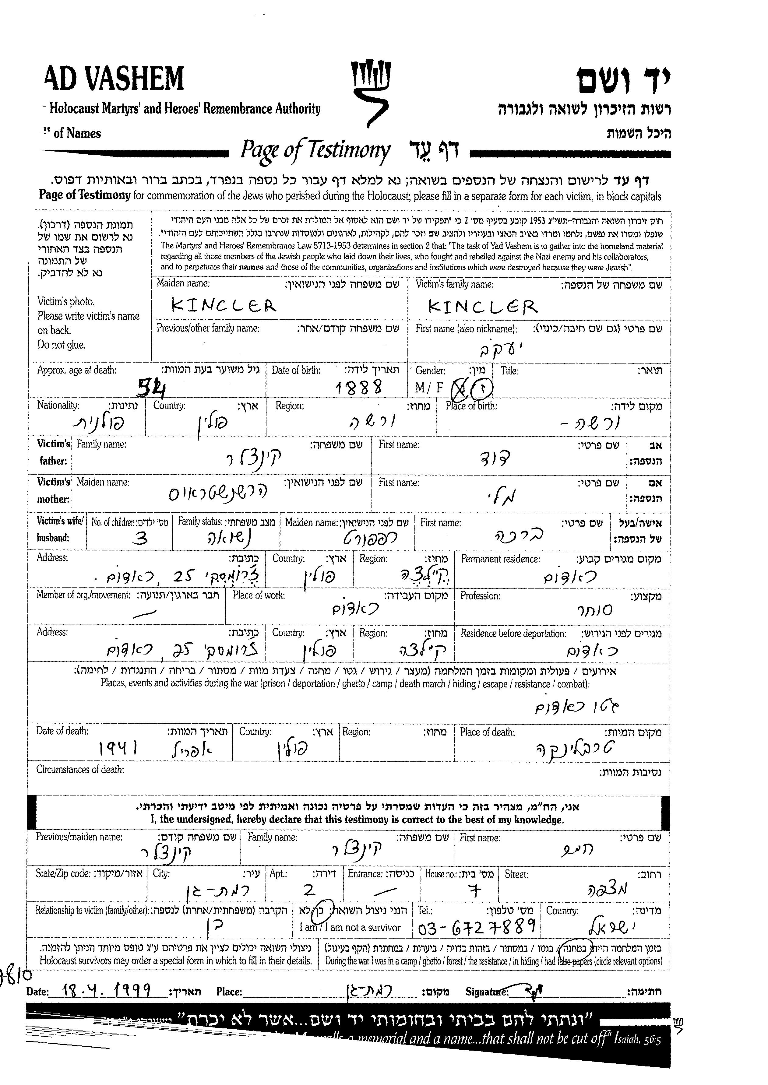 Kincler Yaakov 1888 Radom, Pologne Feuille de témoignage
