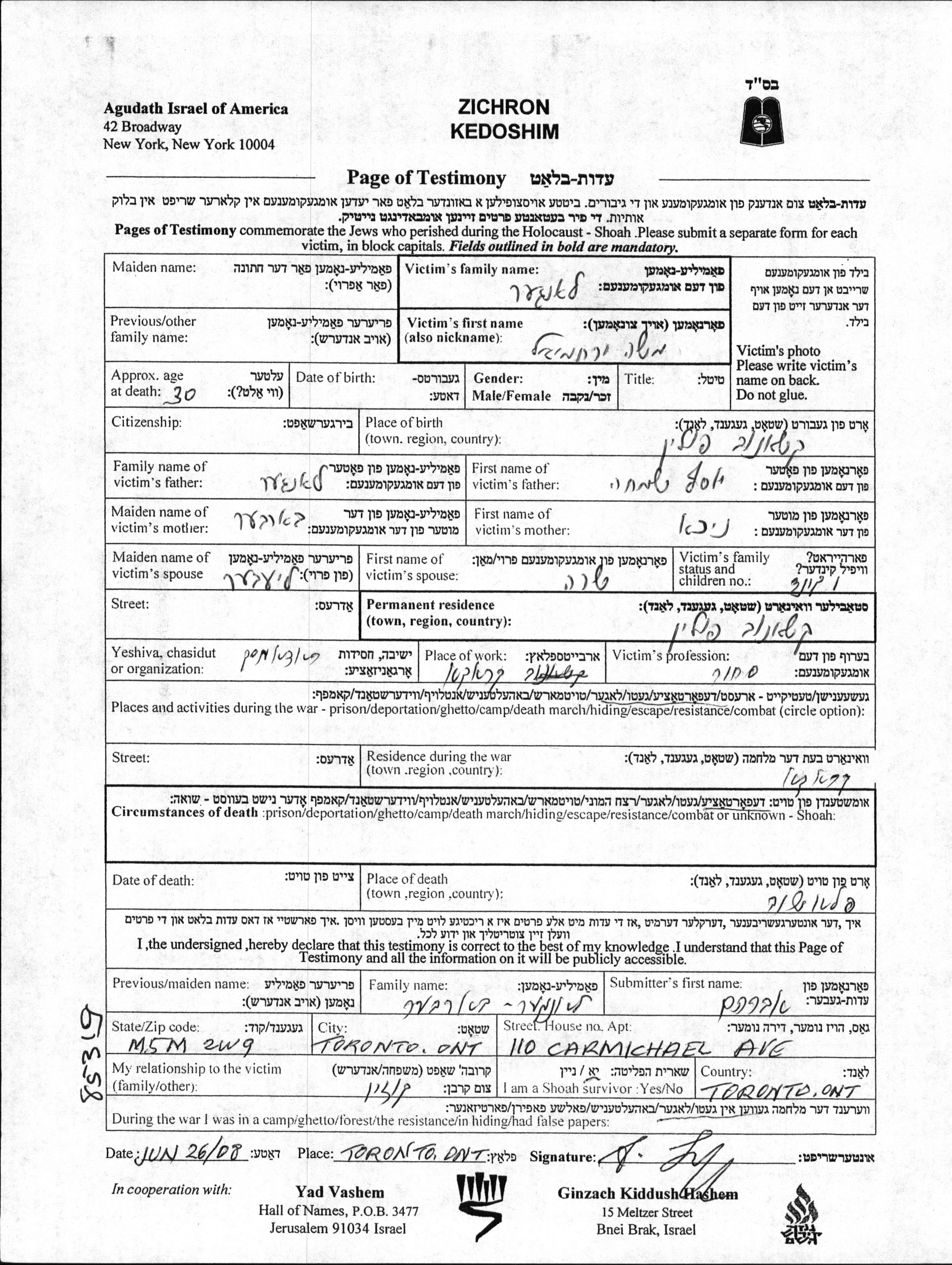 Yad Vashem - Pages of Testimony Names Memorial Collection