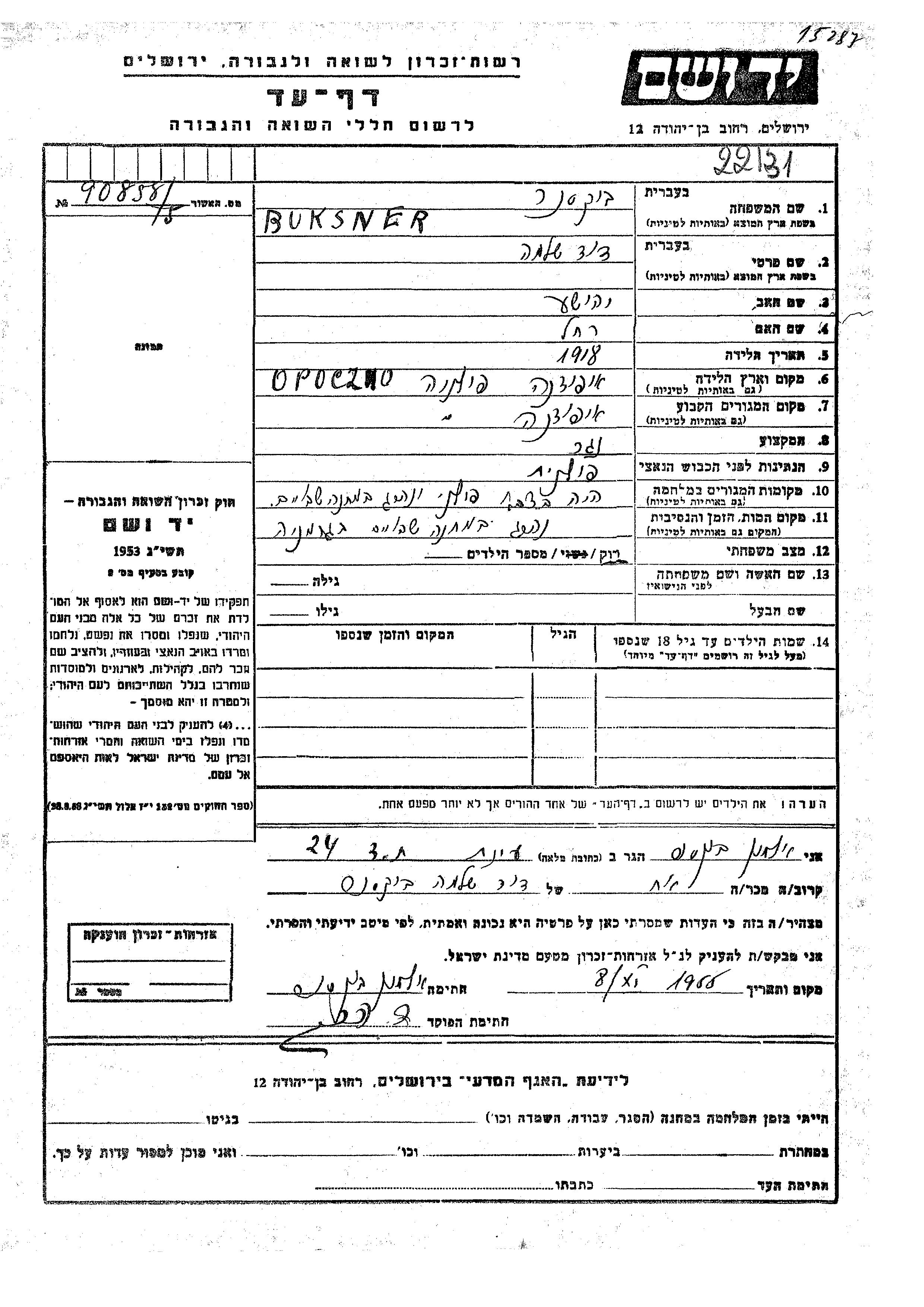 Buksner David Shlomo 1918 Opoczno, Pologne Feuille de témoignage