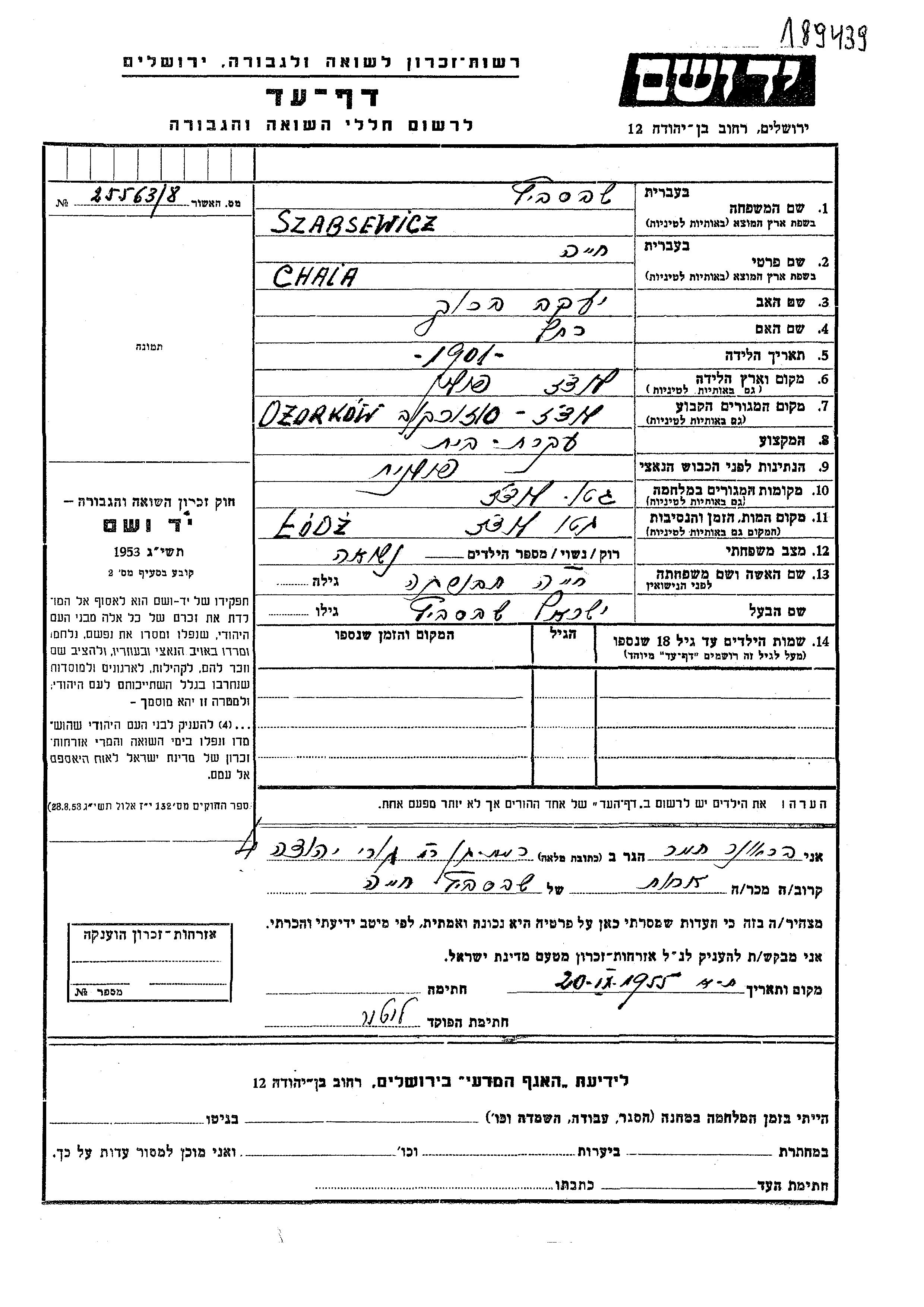 | Szabsewicz | Chaia | 1901 | Ozorkow, Pologne | Feuille de témoignage |