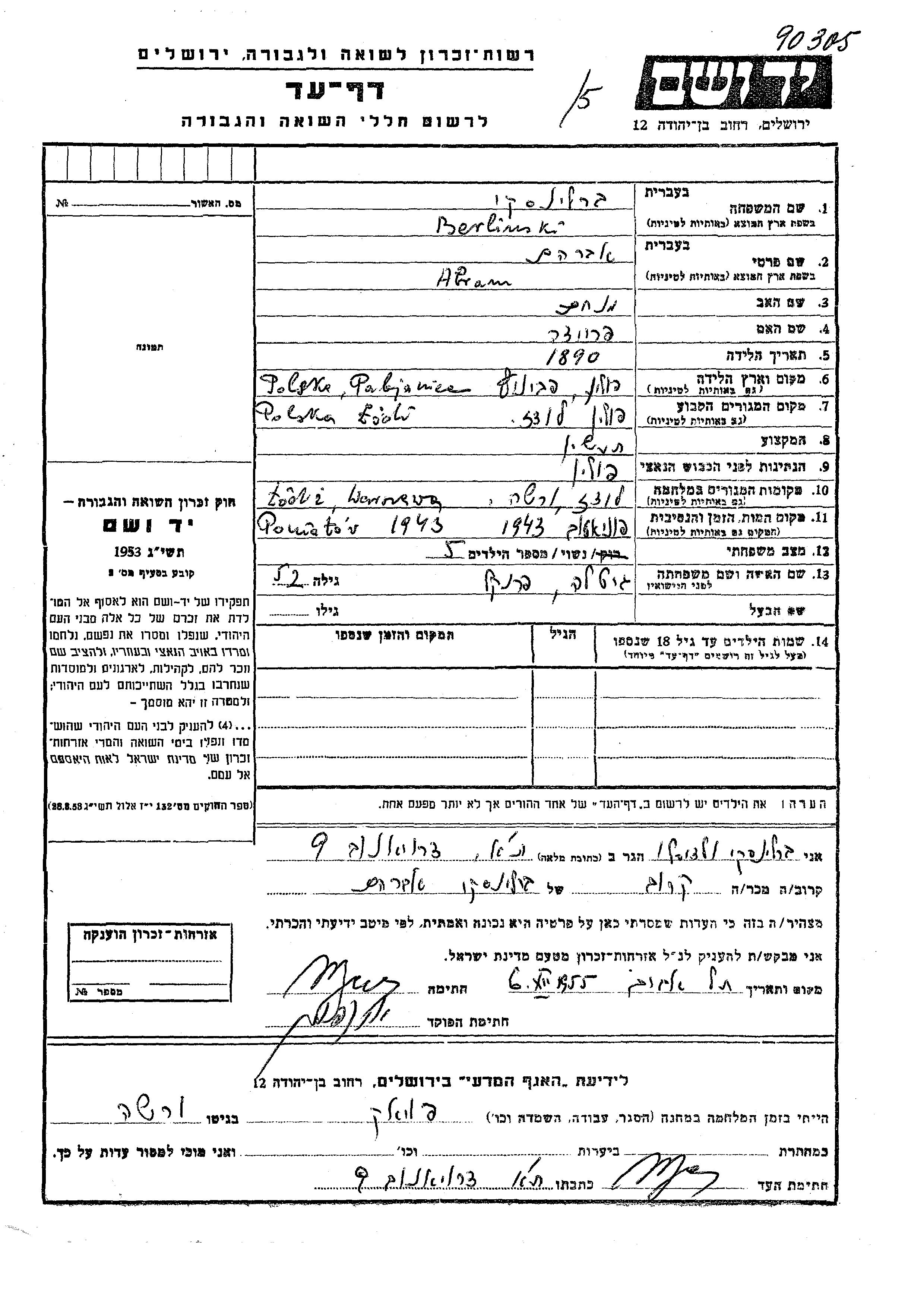 Berlinski Abram 1890 Lodz, Pologne Feuille de témoignage