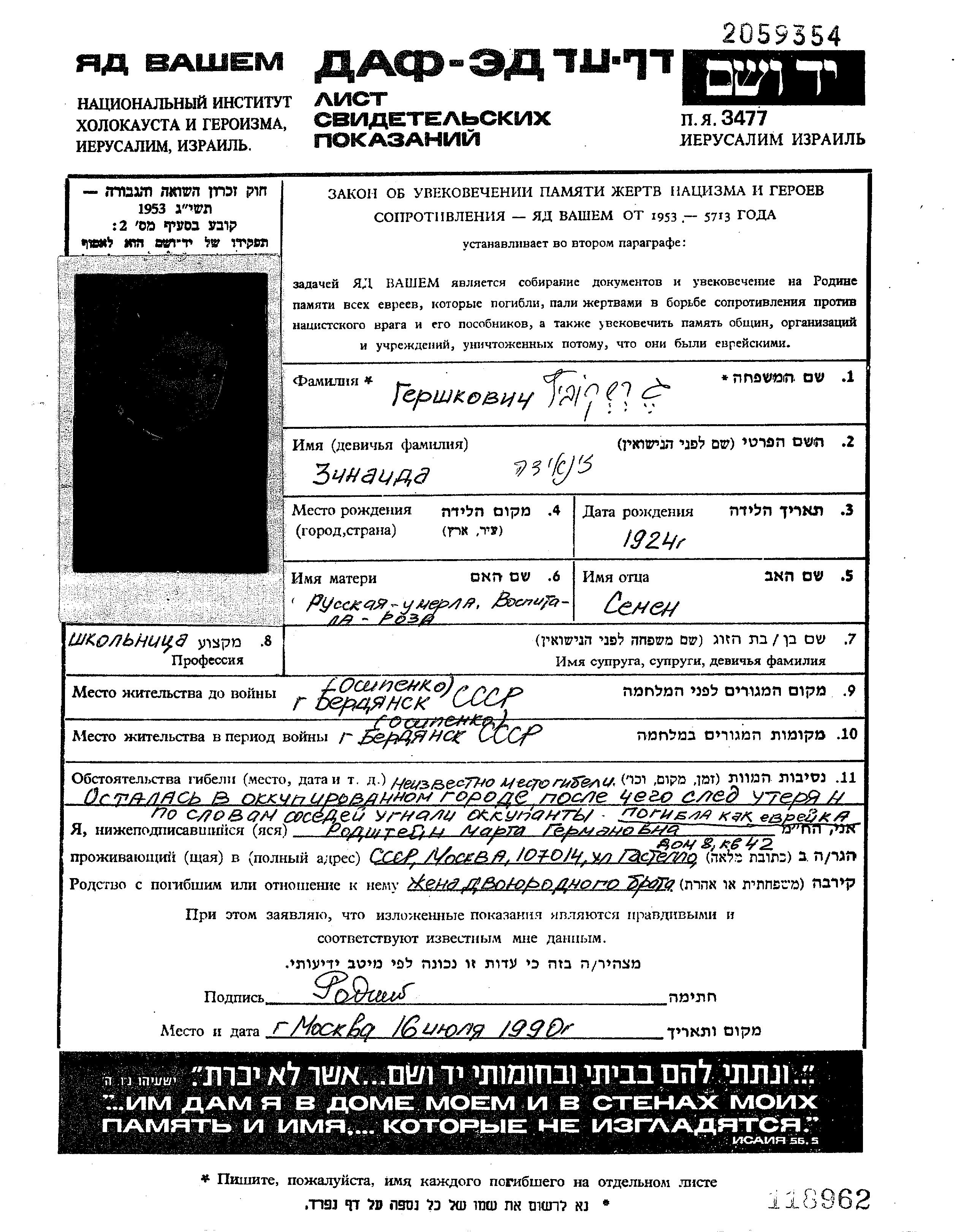 Gershkovich Zina 1924 Berdyansk, Ukraine (URSS) Feuille de témoignage