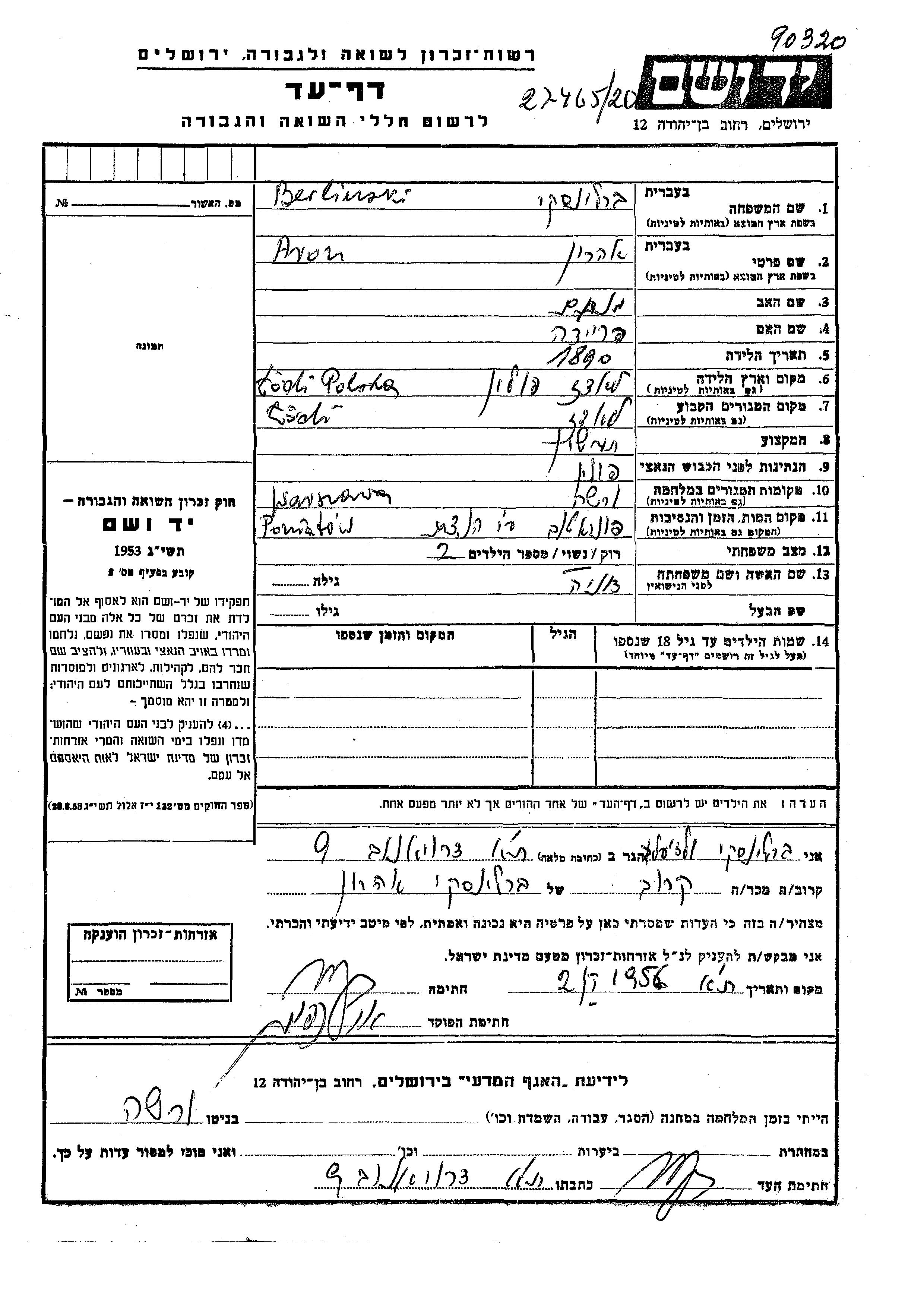 Berlinski Aron 1890 Lodz, Pologne Feuille de témoignage